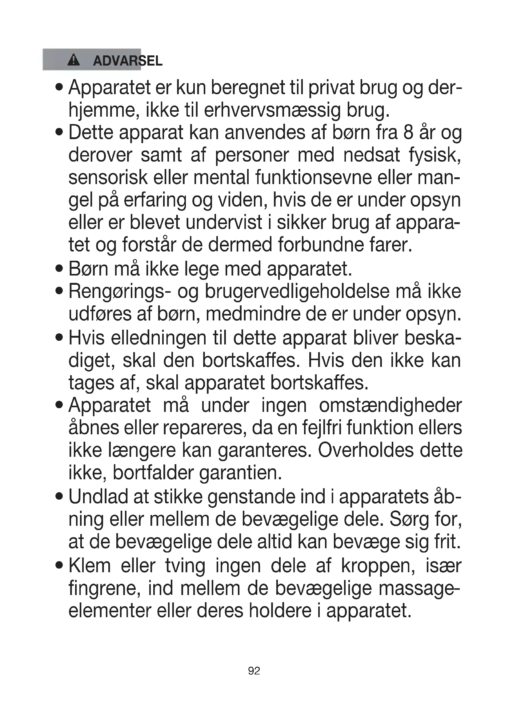 HEDSANVISNINGER ADVARSEL Anvend ikke apparatet ved en sygdoms- mæssig ændring eller skade i det kropsom- råde, hvor der skal masseres (f.eks. diskus- prolaps, åbent sår).