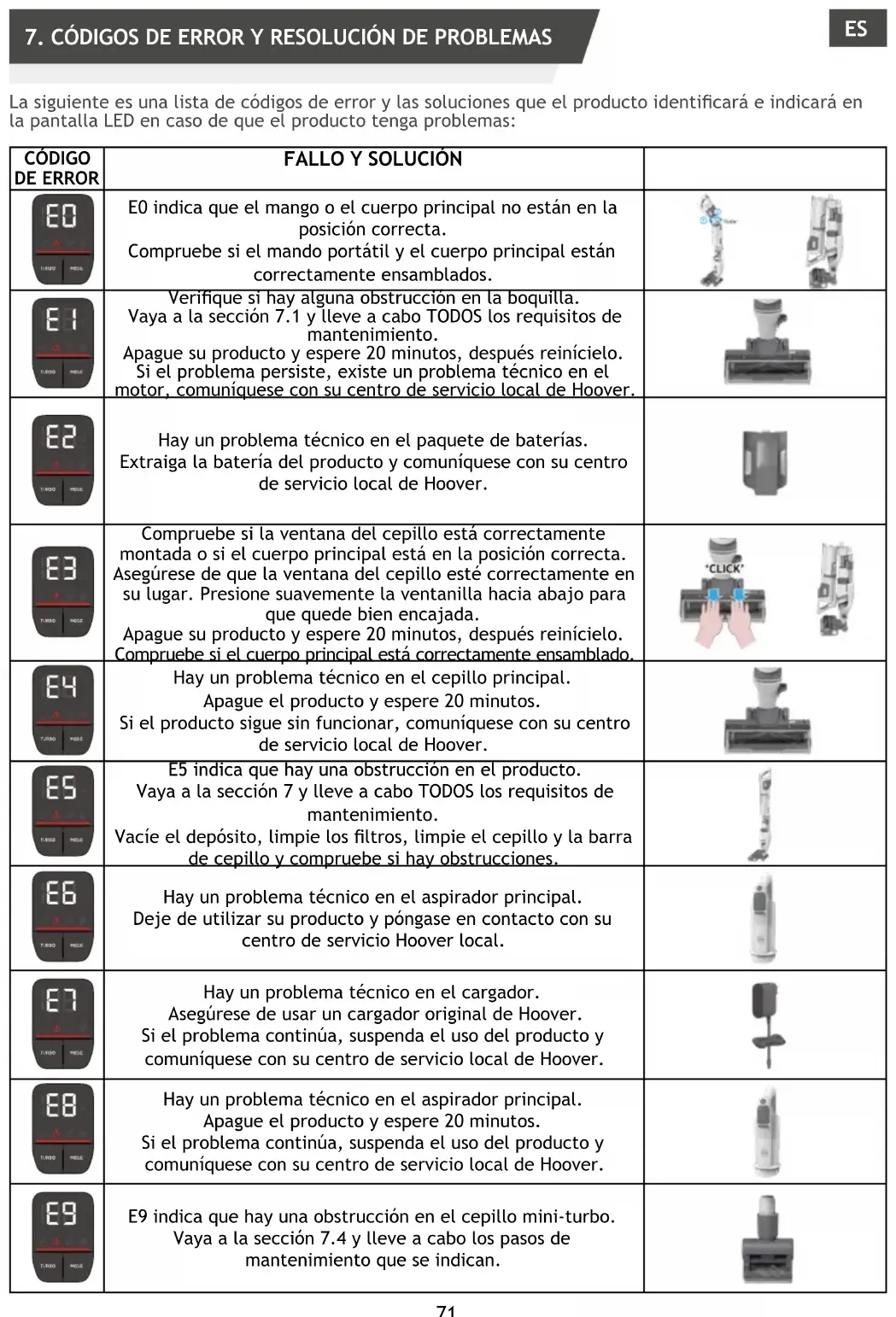E0 angiver, at den håndholdte enhed eller hovedkroppen ikke er sat korrekt i. Kontroller, at den håndholdte enhed og hovedkroppen er monteret korrekt. Tjek om der er en blokering i mundstykket. Gå til afsnit 7.1 og udfør ALLE vedligeholdelseskravene. Sluk dit produkt og vent i 20 minutter, og genstart det derefter. Hvis problemet fortsætter, er der et teknisk problem på motoren, kontakt dit lokale Hoover-servicecenter. Der er et teknisk problem med batteripakken. Fjern batteriet fra dit produkt og kontakt dit lokale Hoover- servicecenter. Kontroller, om mundstykkevinduet er korrekt samlet, eller om hovedkroppen er i den rigtige position. Sørg for, at mundstykkevinduet er sat korrekt i. Tryk forsigtigt vinduet ned for at klikke det sikkert ind. Sluk dit produkt og vent i 20 minutter, og genstart det derefter. Kontroller, at hovedkroppen er monteret korrekt. Der er et teknisk problem med hovedmundstykket. Sluk for dit produkt og vent 20 minutter. Hvis produktet stadig ikke fungerer, skal du kontakte dit lokale Hoover-servicecenter. E5 indikerer, at der er en blokering i dit produkt. Gå til afsnit 7 og udfør ALLE vedligeholdelseskravene. Tøm beholderen, rengør ltrene, rengør mundstykket og børstestangen, og tjek om der er tilstopninger. Der er et teknisk problem med hovedstøvsugeren. Stop brugen af produktet, og kontakt dit lokale Hoover- servicecenter. Der er et teknisk problem med opladeren. Sørg for, at du kun bruger en original HOOVER-oplader. Hvis problemet varer ved, skal du stoppe brugen af produktet og kontakte dit lokale Hoover-servicecenter. Der er et teknisk problem med hovedstøvsugeren. Sluk for dit produkt og vent 20 minutter. Hvis problemet varer ved, skal du stoppe brugen af produktet og kontakte dit lokale Hoover-servicecenter. E9 indikerer, at der er en blokering i mini-turbomundstykket. Gå til afsnit 7.4 og udfør den angivne vedligeholdelseshandling. DKA