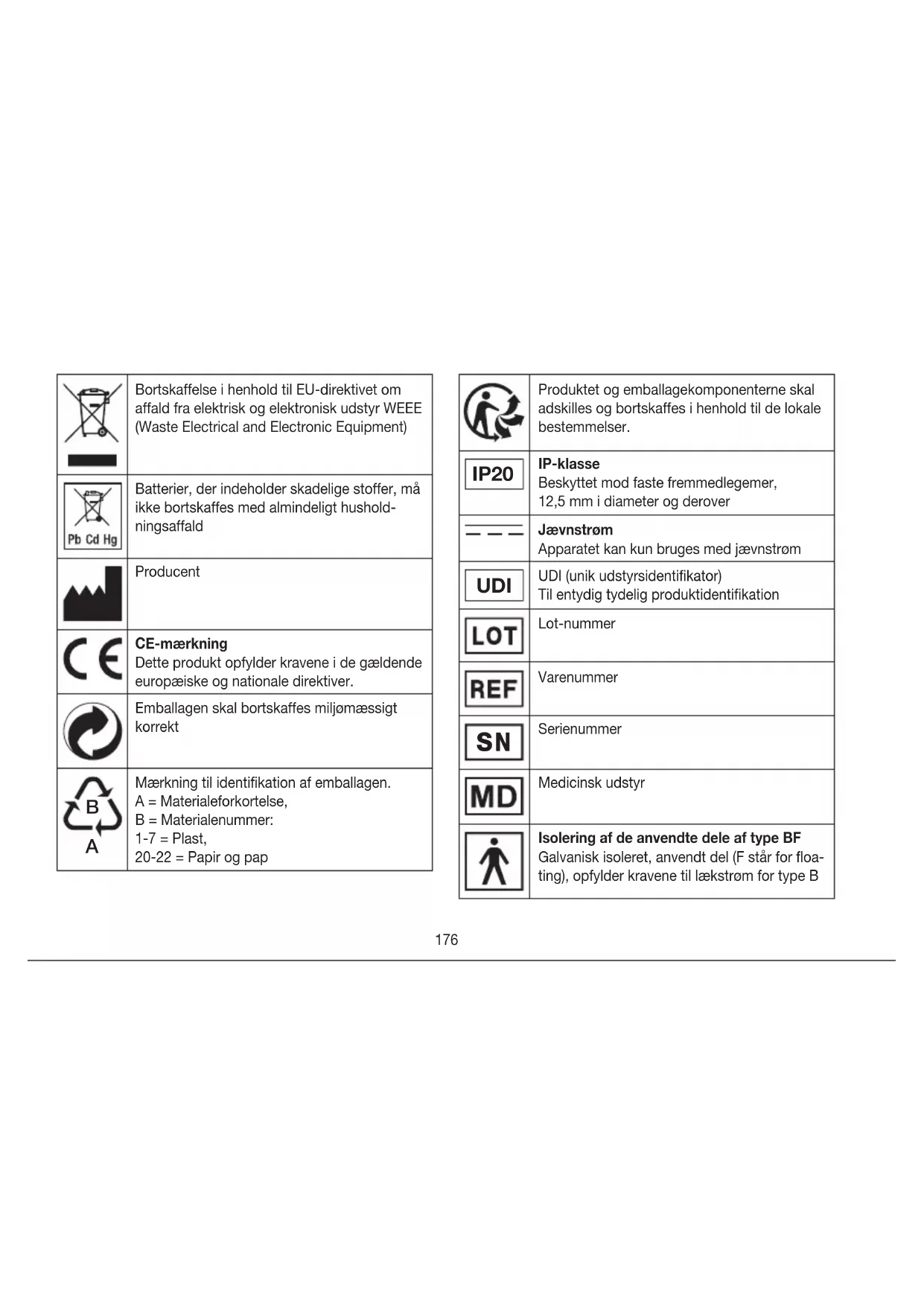 Mærkning til identifikation af emballagen. A = Materialeforkortelse, B = Materialenummer: 1-7 = Plast, 20-22 = Papir og pap Produktet og emballagekomponenterne skal adskilles og bortskaffes i henhold til de lokale bestemmelser. IP20 IP-klasse Beskyttet mod faste fremmedlegemer, 12,5mm i diameter og derover Jævnstrøm Apparatet kan kun bruges med jævnstrøm UDI UDI (unik udstyrsidentifikator) Til entydig tydelig produktidentifikation Lot-nummer Varenummer