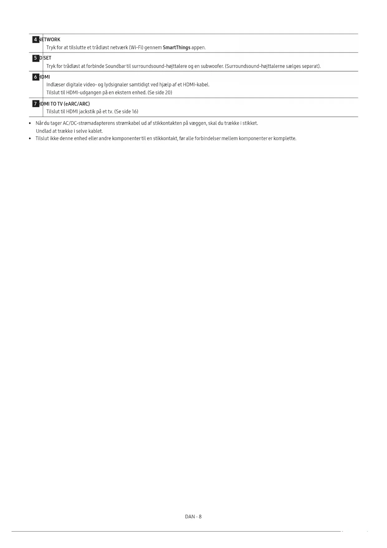 1 DIGITAL AUDIO IN (OPTICAL) Tilslut den digitale (optiske) udgang af en ekstern enhed. (Se side 21) 2 SERVICE Tilslut en USB-lagringsenhed for at opgradere produktets software. 3 DC 19V (Strømforsyning ind) Tilslut AC/DC strømadapter. (Se side 13)DAN - 8 4 NETWORK Tryk for at tilslutte et trådløst netværk (Wi-Fi) gennem SmartThings appen. 5 ID SET Tryk for trådløst at forbinde Soundbar til surroundsound-højttalere og en subwoofer. (Surroundsound-højttalerne sælges separat). 6 HDMI Indlæser digitale video- og lydsignaler samtidigt ved hjælp af et HDMI-kabel. Tilslut til HDMI-udgangen på en ekstern enhed. (Se side 20) 7 HDMI TO TV (eARC/ARC) Tilslut til HDMI jackstik på et tv. (Se side 16)