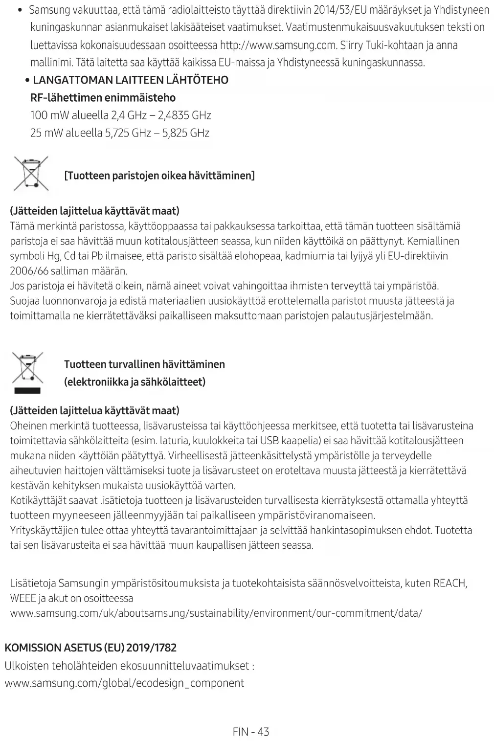 - TRÅDLØS ENHEDSOUTPUTEFFEKT Maksimal RF-sendereffekt 100 mW ved 2,4 GHz – 2,4835 GHz 25 mW ved 5,725 GHz – 5,825 GHz [Korrekt bortskaffelse af batterierne i dette produkt] (Gælder i lande med systemer til affaldssortering) Denne mærkning på batteriet, i manualen eller på emballagen betyder, at batterierne i dette produkt ikke må bortskaffes sammen med almindeligt husholdningsaffald efter endt levetid. Er batterierne mærket med de kemiske symboler Hg, Cd eller Pb, betyder det, at deres indhold af kviksølv, cadmium eller bly ligger over de grænseværdier, som er fastsat i EU-direktiv 2006/66. Hvis batterierne ikke bortskaffes korrekt, kan disse stoffer være skadelige for menneskers helbred eller miljøet. Hjælp til med at beskytte naturens ressourcer og fremme genbrug ved at holde batterierne adskilt fra andre typer af affald og ved at indlevere dem på en genbrugsplads. Korrekt bortskaffelse af dette produkt (elektrisk & elektronisk udstyr) (Gælder i lande med systemer til affaldssortering) Denne mærkning på produktet, på tilbehør eller i manualen betyder, at produktet og elektronisk tilbehør hertil (f.eks. oplader, headset og USB-kabel) ikke må bortskaffes sammen med almindeligt husholdningsaffald efter endt levetid. For at forebygge skadelige virkninger på menneskers helbred eller miljøet skal disse genstande bortskaffes adskilt fra andre typer af affald og indleveres på en genbrugsplads med henblik på genindvinding. Forbrugere bedes kontakte forhandleren, hvor de har købt produktet, ellerkommunen for nærmere oplysning om, hvor og hvordan de kan indlevere produkt og tilbehør med henblik på miljøvenlig genindvinding. Virksomheder bedes kontakte leverandøren og følge anvisningerne i købekontrakten. Dette produkt og elektronisk tilbehør hertil må ikke bortskaffes sammen med andet erhvervsaffald. For informationer om Samsungs miljøforpligtelser og produktspecikke, regulativforpligtelser såsom REACH, WEEE, batterier skal du besøge: www.samsung.com/uk/aboutsamsung/sustainability/environment/our-commitment/data/
