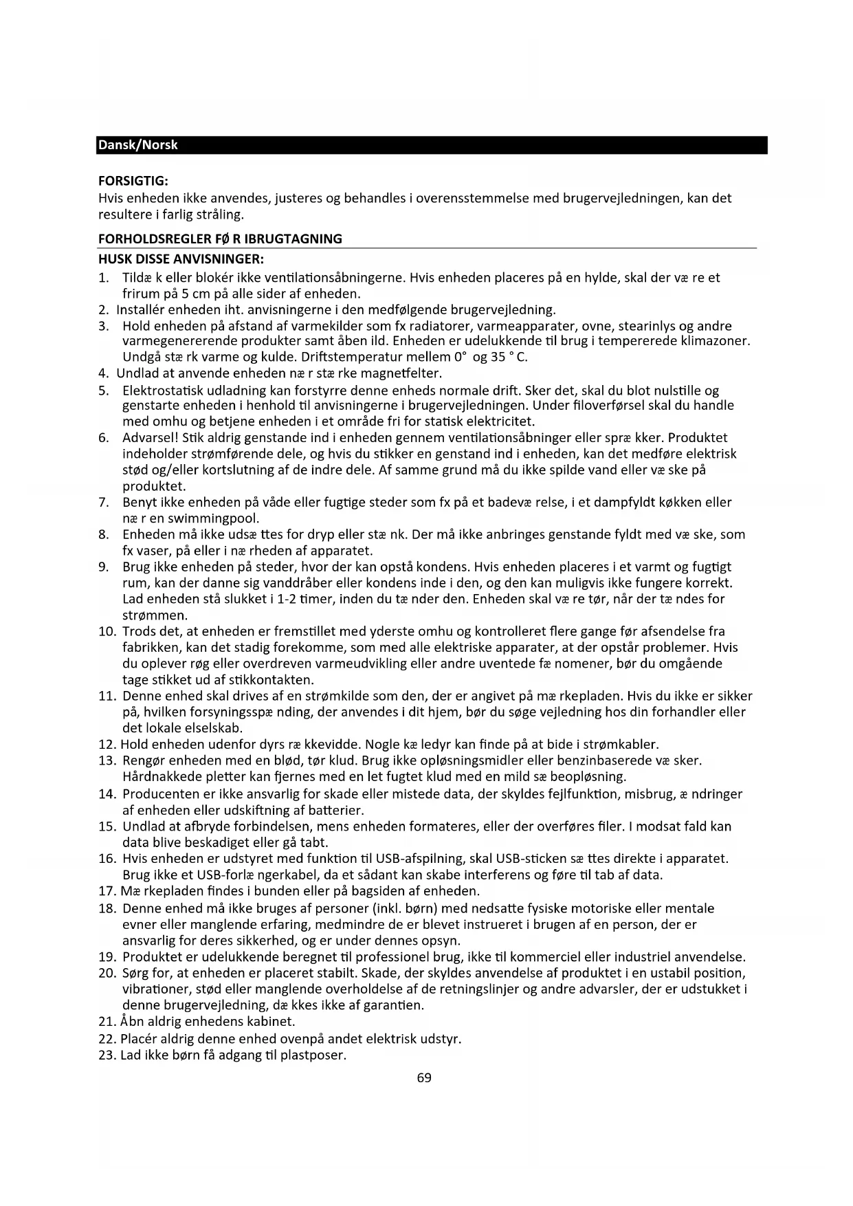 22. Placér aldrig denne enhed ovenpå andet elektrisk udstyr.