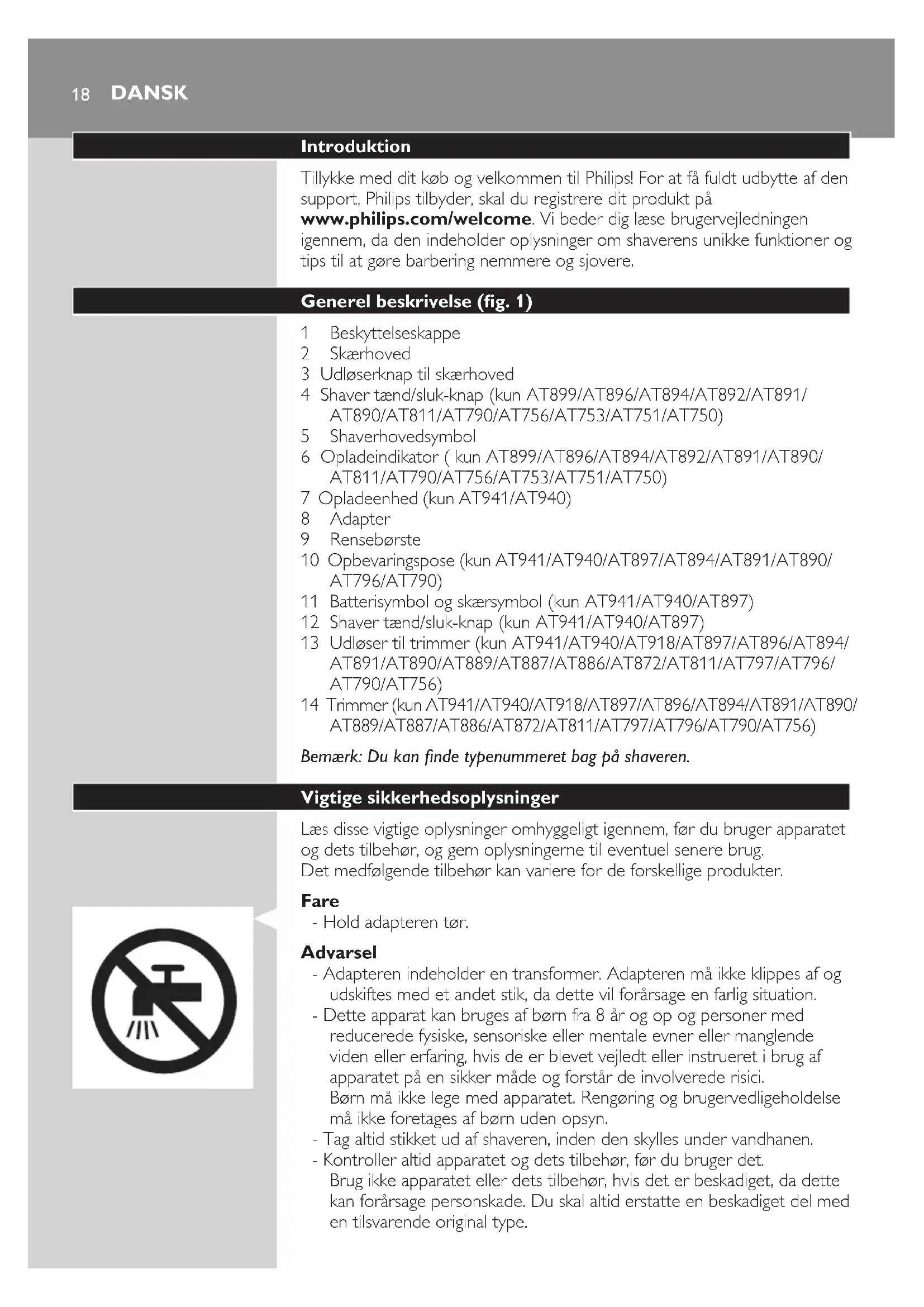 5 sec. ENGLISH 15Recycling - This symbol on a product means that the product is covered by European Directive 2012/19/EU. - This symbol means that the product contains a built-in rechargeable battery covered by European Directive 2006/66/EC which cannot be disposed of with normal household waste. We strongly advise you to take your product to an ofcial collection point or a Philips service centre to have a professional remove the rechargeable battery. - Inform yourself about the local separate collection system for electrical and electronic products and rechargeable batteries. Follow local rules and never dispose of the product and rechargeable batteries with normal household waste. Correct disposal of old products and rechargeable batteries helps prevent negative consequences for the environment and human health. Removing the rechargeable shaver battery Only remove the rechargeable battery when you discard the shaver. Make sure the rechargeable battery is completely empty when you remove it. 1 Undo the screws in the back of the shaver and in the hair chamber. 2 Remove the front panel and the back panel. 3 Bend the 6 hooks aside and take out the power unit. Be careful, the hooks are sharp. 4 Remove the rechargeable battery. Guarantee and support If you need information or support, please visit www.philips.com/support or read the separate worldwide guarantee leaet. Guarantee restrictions The shaving heads (cutters and guards) are not covered by the terms of the international guarantee because they are subject to wear. ENGLISH16Troubleshooting This chapter summarises the most common problems you could encounter with the appliance. If you are unable to solve the problem with the information below, visit www.philips.com/support for a list of frequently asked questions or contact the Consumer Care Centre in your country. Problem Possible cause Solution The shaver does not shave as well as it used to. The shaving heads are damaged or worn. Replace the shaving heads (see chapter ‘Replacement’). Foam or gel residues clog up the shaving heads. Rinse the shaving unit under a hot tap (see chapter ‘Cleaning and maintenance’). Long hairs obstruct the shaving heads. Clean the shaving heads one by one (see chapter ‘Cleaning and maintenance’). You have not inserted the shaving heads properly. Make sure that the projections of the shaving heads t exactly into the recesses (see chapter ‘Cleaning and maintenance’). The shaver does not work when I press the on/off button. The rechargeable battery is empty. Recharge the battery (see chapter ‘Charging’). The temperature of the shaver is too high. In this case, the shaver does not work. As soon as the temperature of the shaver has dropped sufciently, you can switch on the shaver again. The shaver does not work, although it is connected to the mains. The shaver is not designed to be used directly from the mains. Recharge the battery (see chapter ‘Charging’) and disconnect it from the mains. ENGLISH 1718 Introduktion Tillykke med dit køb og velkommen til Philips! For at få fuldt udbytte af den support, Philips tilbyder, skal du registrere dit produkt på www.philips.com/welcome. Vi beder dig læse brugervejledningen igennem, da den indeholder oplysninger om shaverens unikke funktioner og tips til at gøre barbering nemmere og sjovere. Generel beskrivelse (g. 1) 1 Beskyttelseskappe 2 Skærhoved 3 Udløserknap til skærhoved 4 Shaver tænd/sluk-knap (kun AT899/AT896/AT894/AT892/AT891/ AT890/AT811/AT790/AT756/AT753/AT751/AT750) 5 Shaverhovedsymbol 6 Opladeindikator ( kun AT899/AT896/AT894/AT892/AT891/AT890/ AT811/AT790/AT756/AT753/AT751/AT750) 7 Opladeenhed (kun AT941/AT940) 8 Adapter 9 Rensebørste 10 Opbevaringspose (kun AT941/AT940/AT897/AT894/AT891/AT890/ AT796/AT790) 11 Batterisymbol og skærsymbol (kun AT941/AT940/AT897) 12 Shaver tænd/sluk-knap (kun AT941/AT940/AT897) 13 Udløser til trimmer (kun AT941/AT940/AT918/AT897/AT896/AT894/ AT891/AT890/AT889/AT887/AT886/AT872/AT811/AT797/AT796/ AT790/AT756) 14 Trimmer (kun AT941/AT940/AT918/AT897/AT896/AT894/AT891/AT890/ AT889/AT887/AT886/AT872/AT811/AT797/AT796/AT790/AT756) Bemærk: Du kan nde typenummeret bag på shaveren. Vigtige sikkerhedsoplysninger Læs disse vigtige oplysninger omhyggeligt igennem, før du bruger apparatet og dets tilbehør, og gem oplysningerne til eventuel senere brug. Det medfølgende tilbehør kan variere for de forskellige produkter. Fare - Hold adapteren tør. Advarsel - Adapteren indeholder en transformer. Adapteren må ikke klippes af og udskiftes med et andet stik, da dette vil forårsage en farlig situation. - Dette apparat kan bruges af børn fra 8 år og op og personer med reducerede fysiske, sensoriske eller mentale evner eller manglende viden eller erfaring, hvis de er blevet vejledt eller instrueret i brug af apparatet på en sikker måde og forstår de involverede risici. Børn må ikke lege med apparatet. Rengøring og brugervedligeholdelse må ikke foretages af børn uden opsyn. - Tag altid stikket ud af shaveren, inden den skylles under vandhanen. - Kontroller altid apparatet og dets tilbehør, før du bruger det. Brug ikke apparatet eller dets tilbehør, hvis det er beskadiget, da dette kan forårsage personskade. Du skal altid erstatte en beskadiget del med en tilsvarende original type. DANSKForsigtig - Opladeren må aldrig kommes ned i vand eller skylles under vandhanen. - Brug kun apparatet til det tilsigtede formål som vist i brugervejledningen. - Af hygiejniske grunde bør apparatet kun anvendes af en og samme person. - Brug ikke adapteren i eller i nærheden af stikkontakter, der indeholder eller har indeholdt en elektrisk luftfrisker, og undgå derved uoprettelige skader på adapteren. - Brug aldrig trykluft, skuresvampe eller skrappe rengøringsmidler som f.eks. benzin, acetone eller lignende til rengøring af apparatet. - Når shaveren rengøres, kan der dryppe lidt vand ud af stikket i bunden. Dette er helt normalt og ganske ufarligt, 