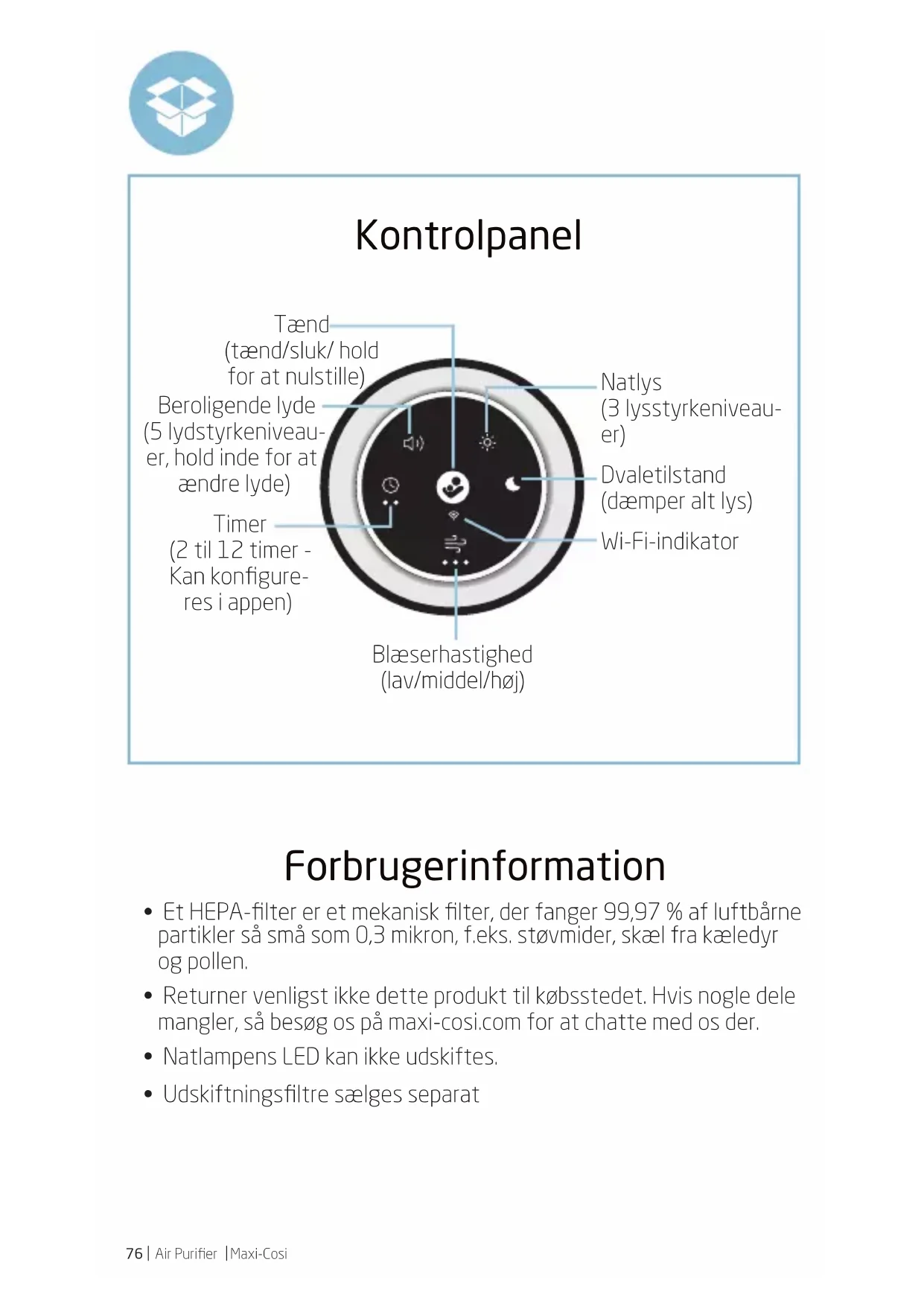 - Udskiftningsfiltre sælges separat Kontrolpanel Blæserhastighed (lav/middel/høj) Wi-Fi-indikator Tænd (tænd/sluk/ hold for at nulstille) Timer (2 til 12 timer - Kan konfigure- res i appen) Beroligende lyde (5 lydstyrkeniveau- er, hold inde for at ændre lyde) Dvaletilstand (dæmper alt lys) Natlys (3 lysstyrkeniveau- er)Maxi-Cosi