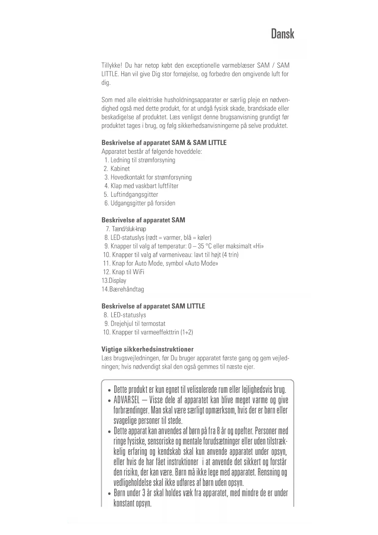 - Reparationer af elektriske apparater må kun udføres af en kvalificeret, elektrisk tekniker. Ibrugtagning / betjening Info: Der er forskel på betjeningen af Sam og Sam little. Vær opmærksom på produktbetegnelsen ved starten af hvert af nedenstående punkter. Hvis der ikke er nævnt noget produkt, gælder betjeningen for begge apparater. Henvisning: Sørg for, at der altid er tilstrækkelig med plads mellem var- meappartet og væggen eller andre store objekter (> 50 cm). Luftstrømmen må ikke standses af eventuelle objekter. Luftgennemstrømningen må ikke blokeres af nogen andre genstande.