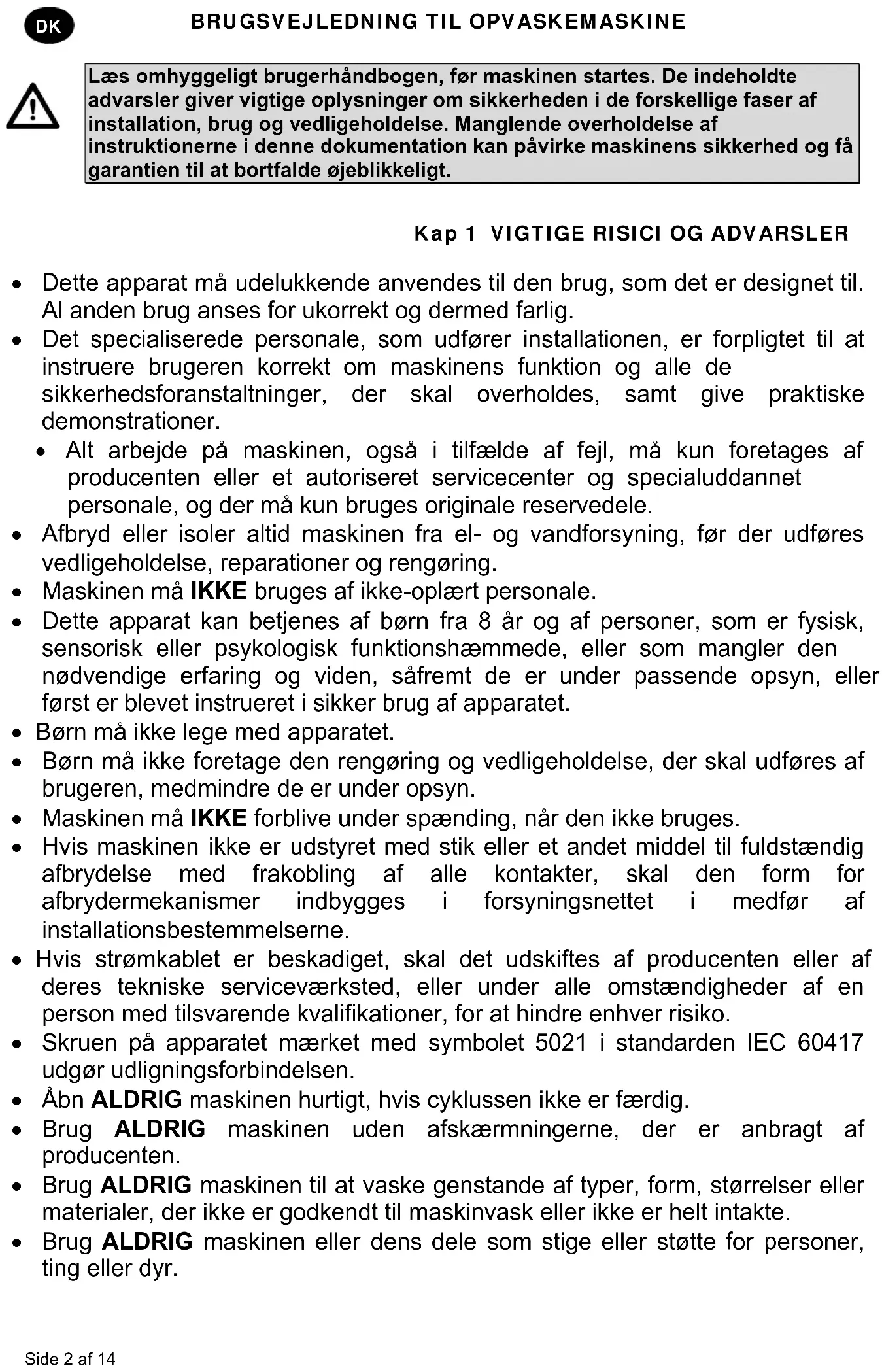 Læs omhyggeligt brugerhåndbogen, før maskinen startes. De indeholdte advarsler giver vigtige oplysninger om sikkerheden i de forskellige faser af installation, brug og vedligeholdelse. Manglende overholdelse af instruktionerne i denne dokumentation kan påvirke maskinens sikkerhed og få garantien til at bortfalde øjeblikkeligt. Kap 1 VIGTIGE RISICI OG ADVARSLER Dette apparat må udelukkende anvendes til den brug, som det er designet til. Al anden brug anses for ukorrekt og dermed farlig. Det specialiserede personale, som udfører installationen, er forpligtet til at instruere brugeren korrekt om maskinens funktion og alle de sikkerhedsforanstaltninger, der skal overholdes, samt give praktiske demonstrationer. Alt arbejde på maskinen, også i tilfælde af fejl, må kun foretages af producenten eller et autoriseret servicecenter og specialuddannet personale, og der må kun bruges originale reservedele. Afbryd eller isoler altid maskinen fra el- og vandforsyning, før der udføres vedligeholdelse, reparationer og rengøring. Maskinen må IKKE bruges af ikke-oplært personale. Dette apparat kan betjenes af børn fra 8 år og af personer, som er fysisk, sensorisk eller psykologisk funktionshæmmede, eller som mangler den nødvendige erfaring og viden, såfremt de er under passende opsyn, eller først er blevet instrueret i sikker brug af apparatet. Børn må ikke lege med apparatet. Børn må ikke foretage den rengøring og vedligeholdelse, der skal udføres af brugeren, medmindre de er under opsyn. Maskinen må IKKE forblive under spænding, når den ikke bruges. Hvis maskinen ikke er udstyret med stik eller et andet middel til fuldstændig afbrydelse med frakobling af alle kontakter, skal den form for afbrydermekanismer indbygges i forsyningsnettet i medfør af installationsbestemmelserne. Hvis strømkablet er beskadiget, skal det udskiftes af producenten eller af deres tekniske serviceværksted, eller under alle omstændigheder af en person med tilsvarende kvalifikationer, for at hindre enhver risiko. Skruen på apparatet mærket med symbolet 5021 i standarden IEC 60417 udgør udligningsforbindelsen. Åbn ALDRIG maskinen hurtigt, hvis cyklussen ikke er færdig. Brug ALDRIG maskinen uden afskærmningerne, der er anbragt af producenten. Brug ALDRIG maskinen til at vaske genstande af typer, form, størrelser eller materialer, der ikke er godkendt til maskinvask eller ikke er helt intakte. Brug ALDRIG maskinen eller dens dele som stige eller støtte for personer, ting eller dyr.BRUGSVEJLEDNING TIL OPVASKEMASKINE Side 3 af 14