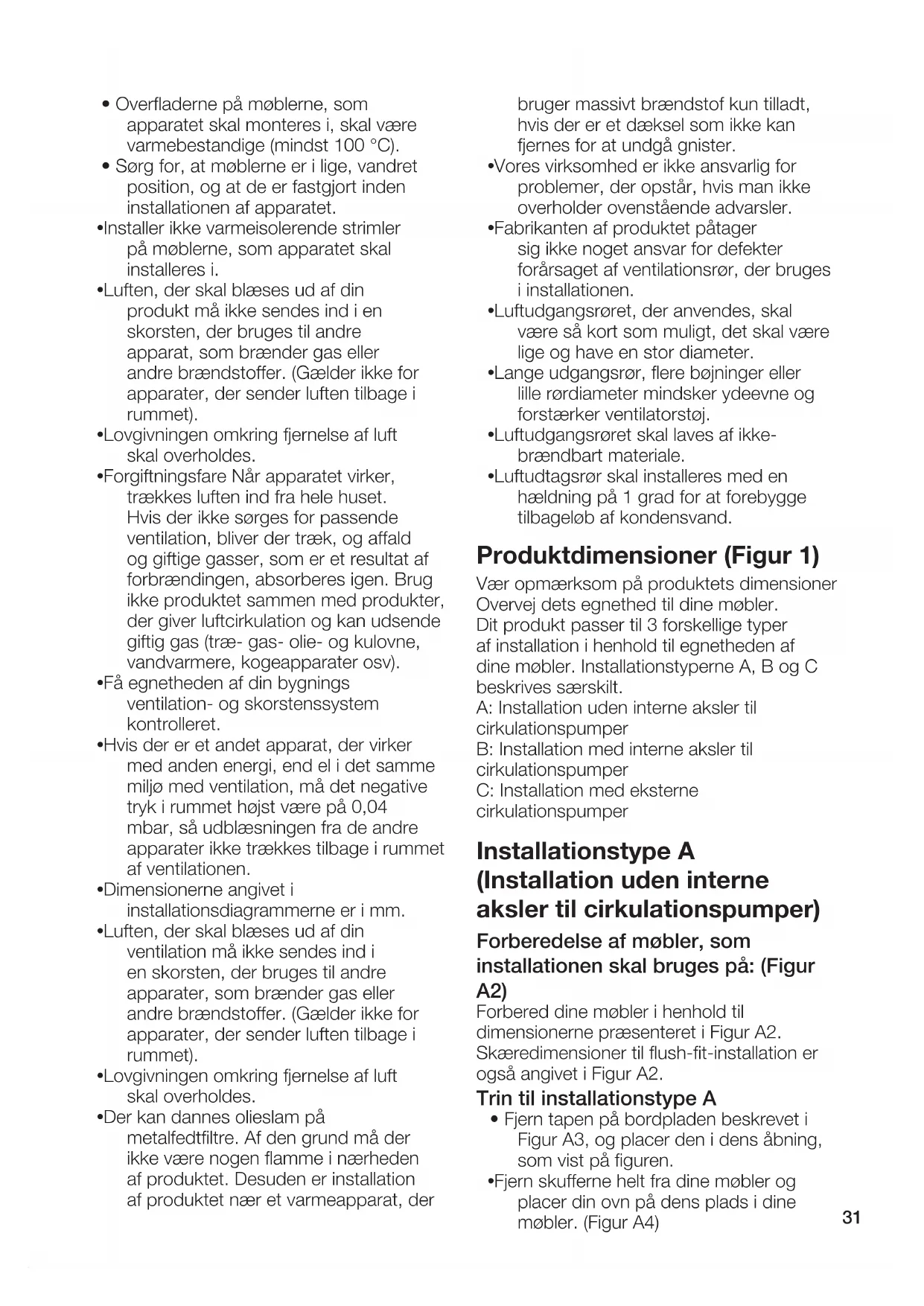 - Luftudtagsrør skal installeres med en hældning på 1 grad for at forebygge tilbageløb af kondensvand. Produktdimensioner (Figur 1) Vær opmærksom på produktets dimensioner Overvej dets egnethed til dine møbler. Dit produkt passer til 3 forskellige typer af installation i henhold til egnetheden af dine møbler. Installationstyperne A, B og C beskrives særskilt. A: Installation uden interne aksler til cirkulationspumper B: Installation med interne aksler til cirkulationspumper C: Installation med eksterne cirkulationspumper Installationstype A (Installation uden interne aksler til cirkulationspumper) Forberedelse af møbler, som installationen skal bruges på: (Figur A2) Forbered dine møbler i henhold til dimensionerne præsenteret i Figur A2. Skæredimensioner til flush-fit-installation er også angivet i Figur A2. Trin til installationstype A