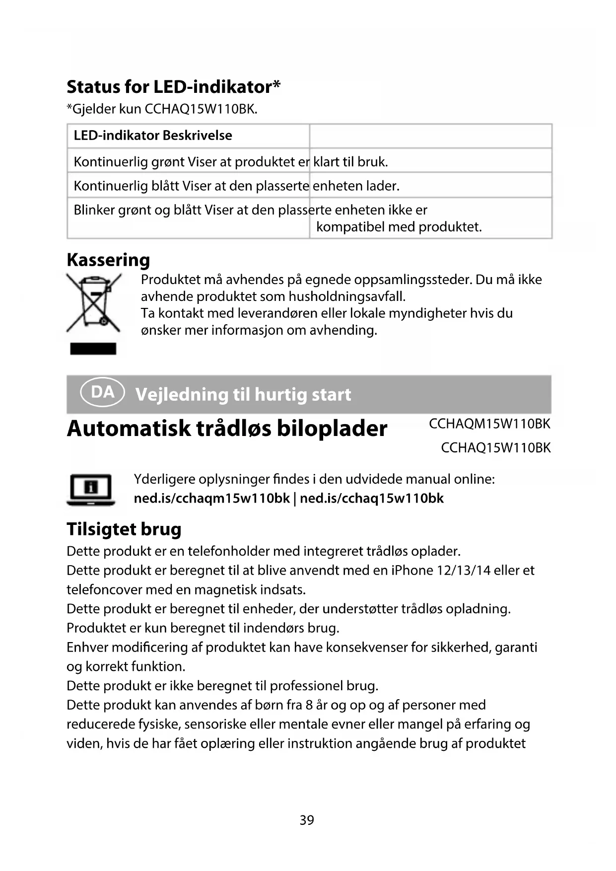LED-indikatorstatus* *Kun gældende for CCHAQ15W110BK. LED-indikator Beskrivelse Fast grøn Indikerer, at produktet er klar til brug. Fast blå Indikerer, at den placerede enhed oplader. Blinker grønt og blåt Indikerer, at den placerede enhed ikke er kompatibelt med produktet. Bortskaelse Produktet skal aeveres på et passende indsamlingspunkt. Bortskaf ikke produktet sammen med husholdningsaald. For mere information, kontakt forhandleren eller den lokale myndighed der er ansvarlig for kontrol af aald.