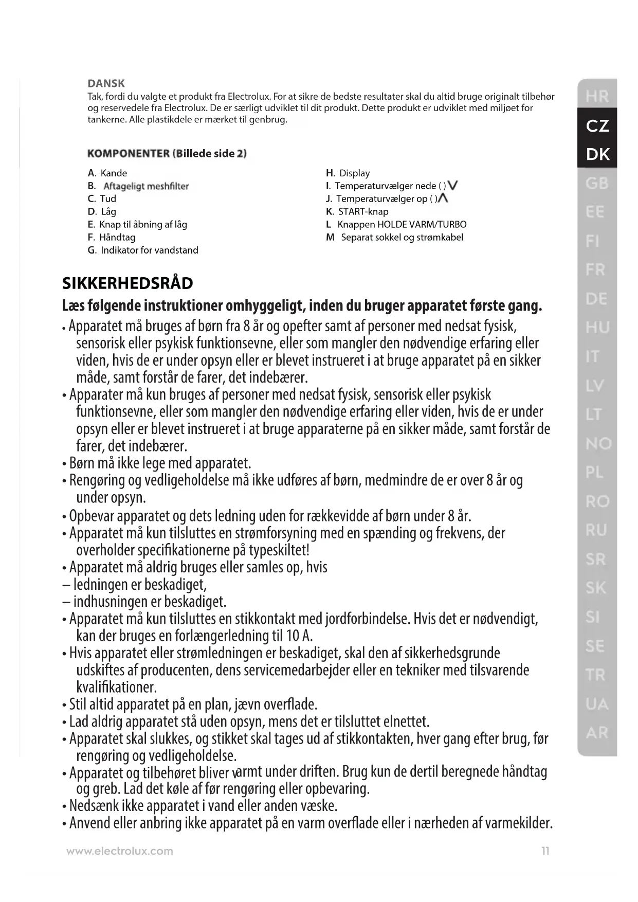 J. Temperaturvælger op ( ) K. START-knap L Knappen HOLDE VARM/TURBO M Separat sokkel og strømkabel SIKKERHEDSRÅD Læs følgende instruktioner omhyggeligt, inden du bruger apparatet første gang.