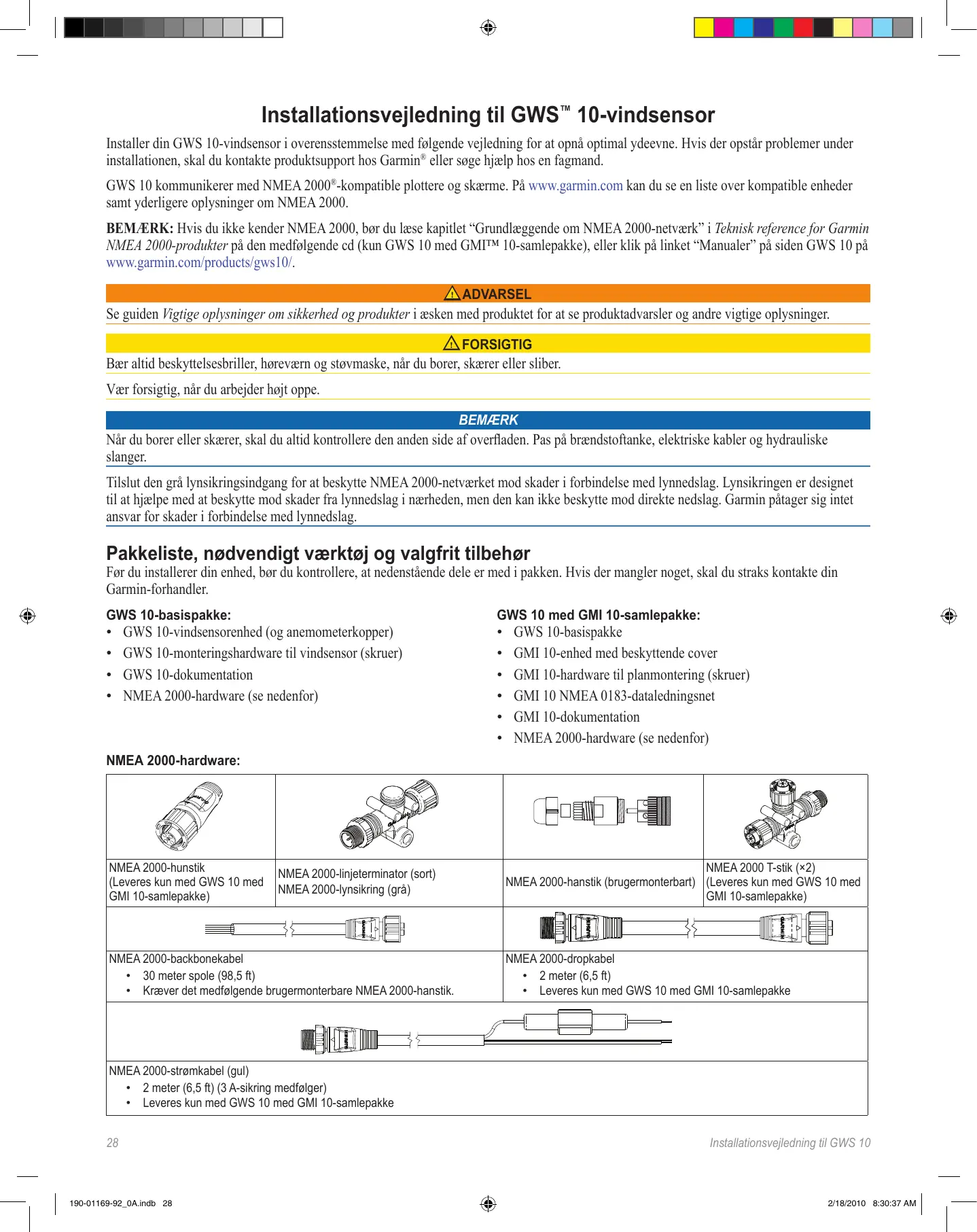 2/18/2010 8:30:37 AM Installationsvejledning til GWS™ 10-vindsensor Installer din GWS 10-vindsensor i overensstemmelse med følgende vejledning for at opnå optimal ydeevne. Hvis der opstår problemer under installationen, skal du kontakte produktsupport hos Garmin® eller søge hjælp hos en fagmand. GWS 10 kommunikerer med NMEA 2000®-kompatible plottere og skærme. På www.garmin.com kan du se en liste over kompatible enheder samt yderligere oplysninger om NMEA 2000. Bemærk: Hvis du ikke kender NMEA 2000, bør du læse kapitlet “Grundlæggende om NMEA 2000-netværk” i Teknisk reference for Garmin NMEA 2000-produkter på den medfølgende cd (kun GWS 10 med GMI™ 10-samlepakke), eller klik på linket “Manualer” på siden GWS 10 på www.garmin.com/products/gws10/. Advarsel
