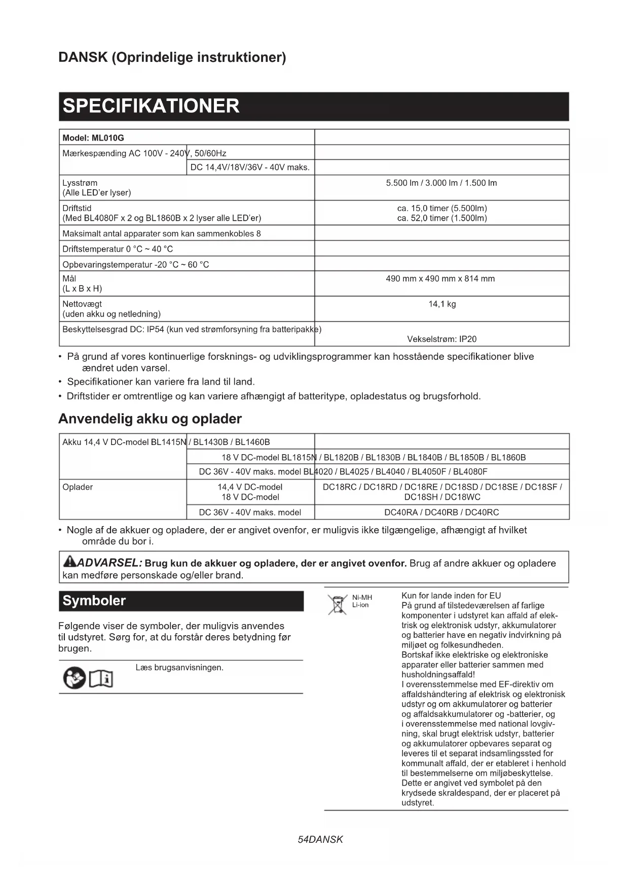 - Original Makita-akku og oplader BEMÆRK: Nogle ting på denne liste kan være inklu- deret i værktøjspakken som standardtilbehør. Det kan være forskellige fra land til land.60 ΕΛΛΗΝΙΚΑ ΕΛΛΗΝΙΚΑ (Αρχικές οδηγίες) ΠΡΟΔΙΑΓΡΑΦΕΣ Μοντέλο: ML010G Ονομαστική τάση A.C. 100 V - 240 V, 50/60 Hz D.C. 14,4 V / 18 V / 36 V - 40 V max Φωτεινή ροή (Ανάβουν όλες οι λυχνίες LED)