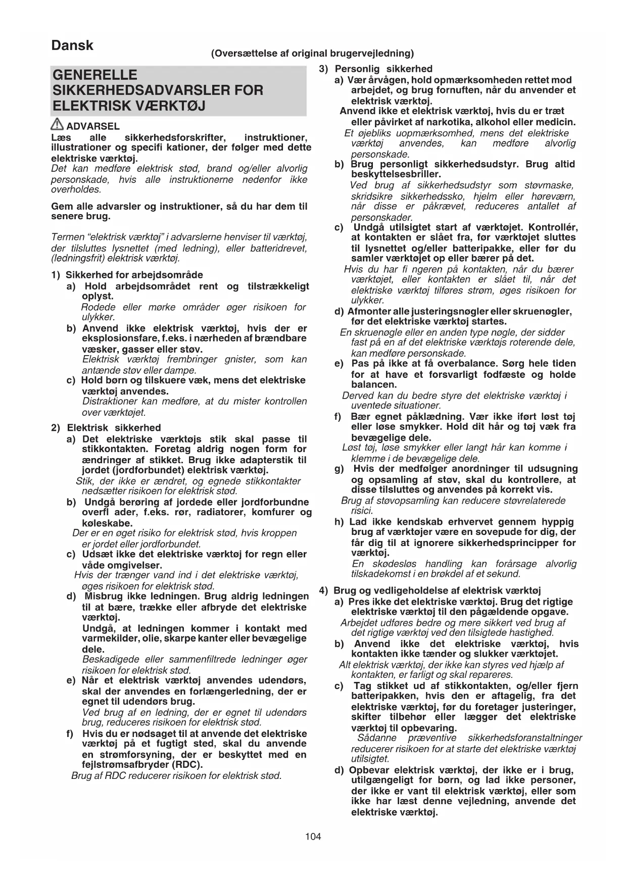 ADVARSEL Læs alle sikkerhedsforskrifter, instruktioner, illustrationer og specifi kationer, der følger med dette elektriske værktøj. Det kan medføre elektrisk stød, brand og/eller alvorlig personskade, hvis alle instruktionerne nedenfor ikke overholdes. Gem alle advarsler og instruktioner, så du har dem til senere brug. Termen “elektrisk værktøj” i advarslerne henviser til værktøj, der tilsluttes lysnettet (med ledning), eller batteridrevet, (ledningsfrit) elektrisk værktøj.