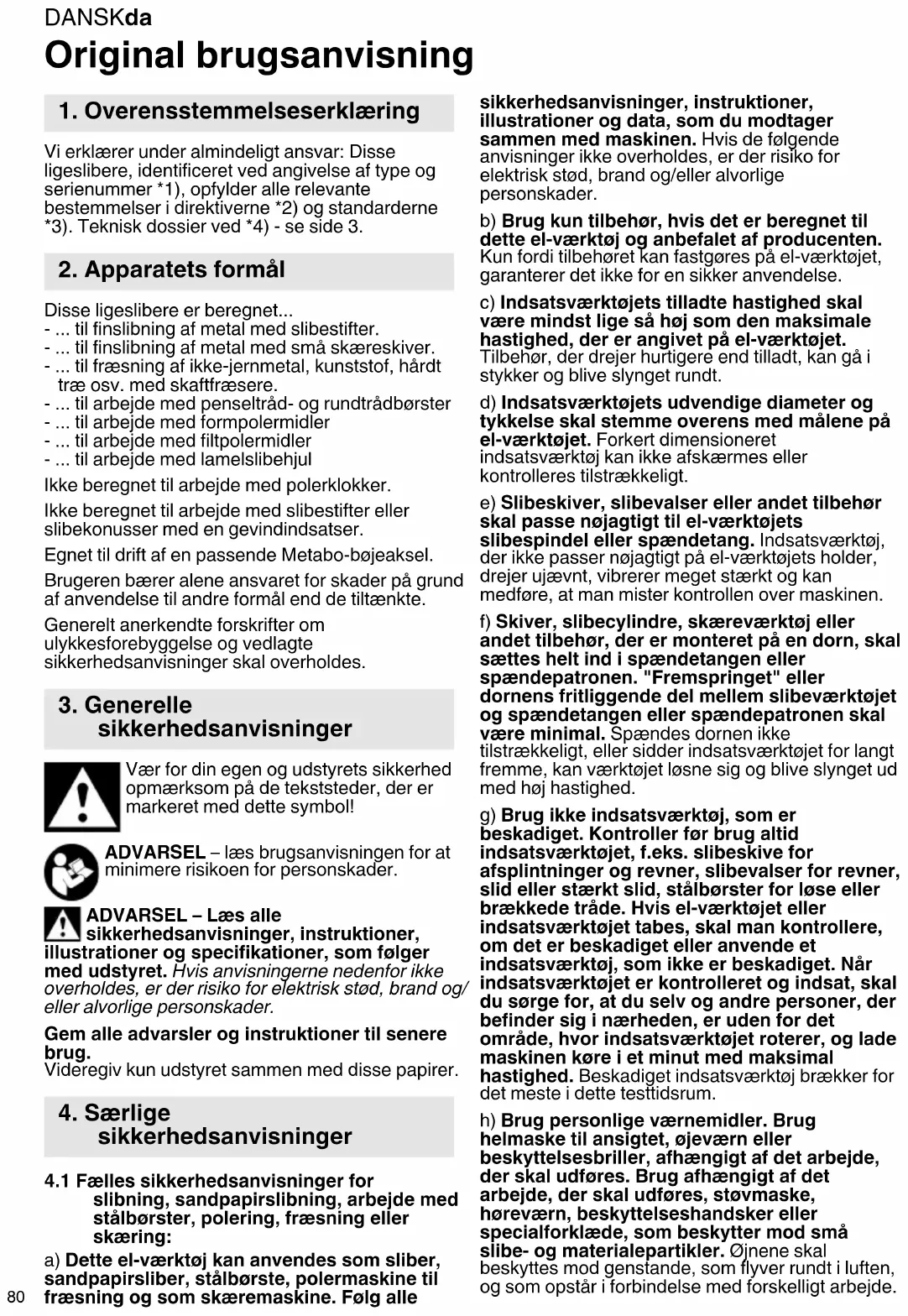 Original brugsanvisning Vi erklærer under almindeligt ansvar: Disse ligeslibere, identificeret ved angivelse af type og serienummer *1), opfylder alle relevante bestemmelser i direktiverne *2) og standarderne *3). Teknisk dossier ved *4) - se side 3. Disse ligeslibere er beregnet... - ... til finslibning af metal med slibestifter. - ... til finslibning af metal med små skæreskiver. - ... til fræsning af ikke-jernmetal, kunststof, hårdt træ osv. med skaftfræsere. - ... til arbejde med penseltråd- og rundtrådbørster - ... til arbejde med formpolermidler - ... til arbejde med filtpolermidler - ... til arbejde med lamelslibehjul Ikke beregnet til arbejde med polerklokker. Ikke beregnet til arbejde med slibestifter eller slibekonusser med en gevindindsatser. Egnet til drift af en passende Metabo-bøjeaksel. Brugeren bærer alene ansvaret for skader på grund af anvendelse til andre formål end de tiltænkte. Generelt anerkendte forskrifter om ulykkesforebyggelse og vedlagte sikkerhedsanvisninger skal overholdes. Vær for din egen og udstyrets sikkerhed opmærksom på de tekststeder, der er markeret med dette symbol! ADVARSEL – læs brugsanvisningen for at minimere risikoen for personskader. ADVARSEL – Læs alle sikkerhedsanvisninger, instruktioner, illustrationer og specifikationer, som følger med udstyret. Hvis anvisningerne nedenfor ikke overholdes, er der risiko for elektrisk stød, brand og/ eller alvorlige personskader. Gem alle advarsler og instruktioner til senere brug. Videregiv kun udstyret sammen med disse papirer.