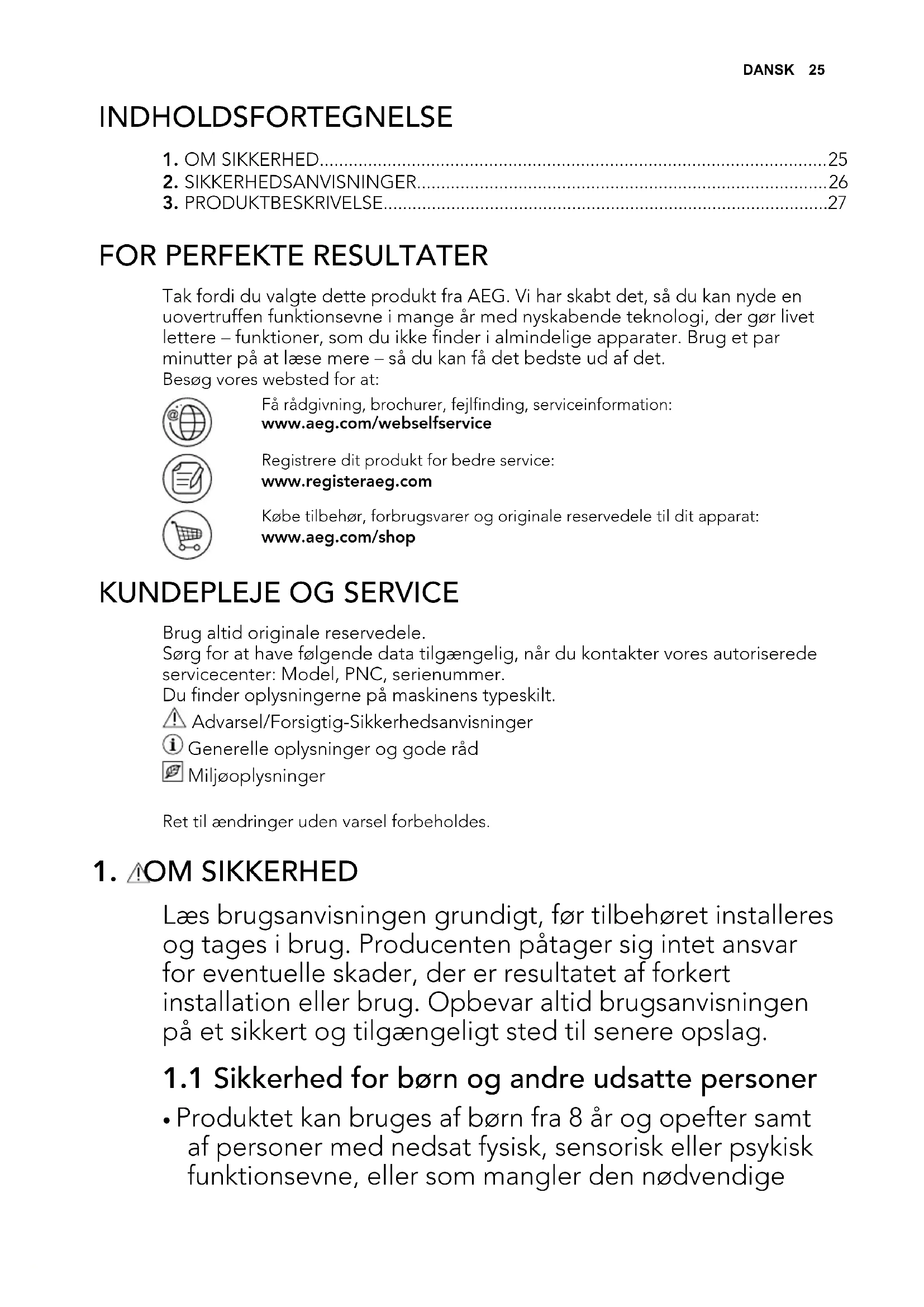 Tak fordi du valgte dette produkt fra AEG. Vi har skabt det, så du kan nyde en uovertruffen funktionsevne i mange år med nyskabende teknologi, der gør livet lettere – funktioner, som du ikke finder i almindelige apparater. Brug et par minutter på at læse mere – så du kan få det bedste ud af det. Besøg vores websted for at: Få rådgivning, brochurer, fejlfinding, serviceinformation: www.aeg.com/webselfservice Registrere dit produkt for bedre service: www.registeraeg.com Købe tilbehør, forbrugsvarer og originale reservedele til dit apparat: www.aeg.com/shop