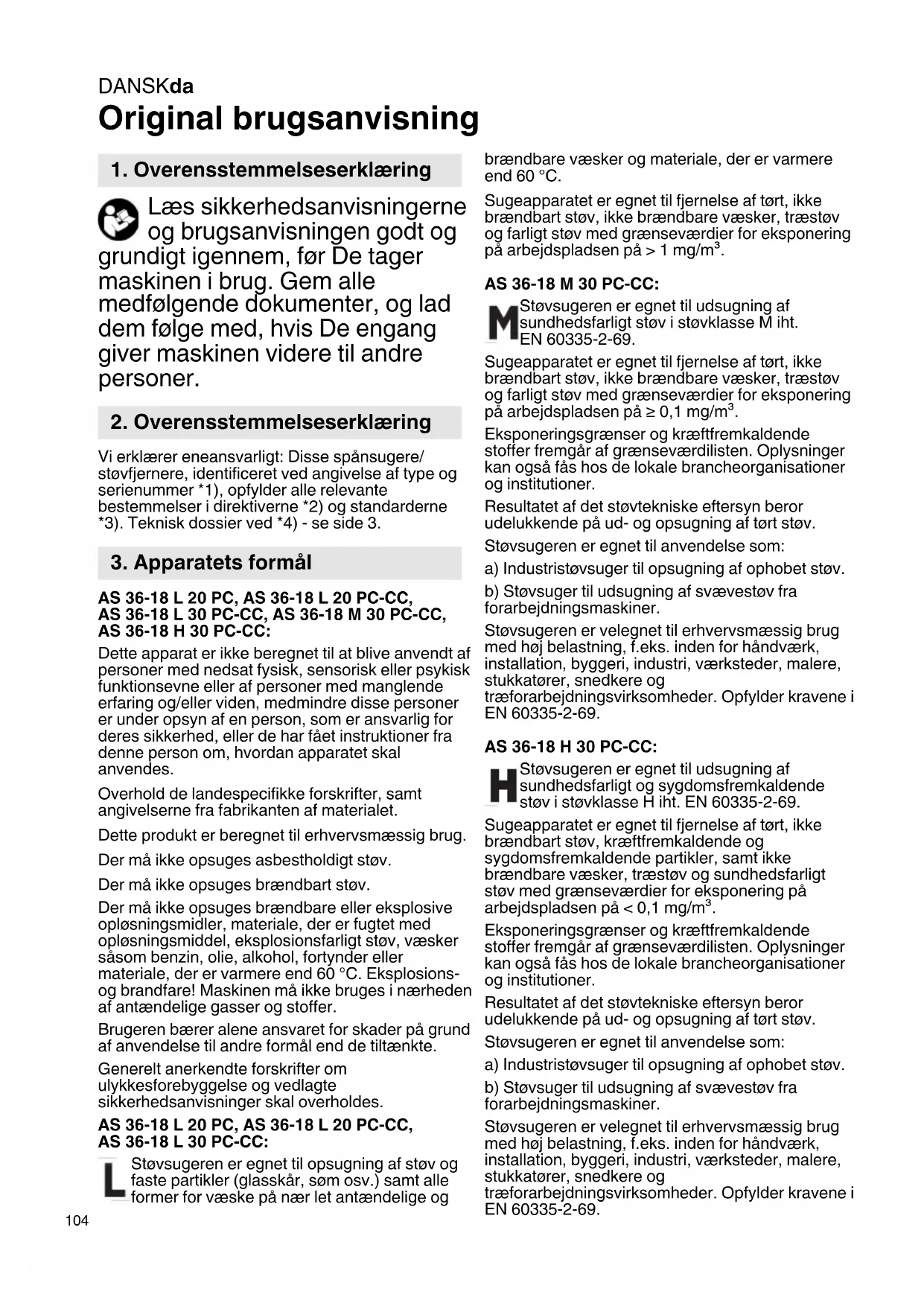 Original brugsanvisning Læs sikkerhedsanvisningerne og brugsanvisningen godt og grundigt igennem, før De tager maskinen i brug. Gem alle medfølgende dokumenter, og lad dem følge med, hvis De engang giver maskinen videre til andre personer. Vi erklærer eneansvarligt: Disse spånsugere/ støvfjernere, identificeret ved angivelse af type og serienummer *1), opfylder alle relevante bestemmelser i direktiverne *2) og standarderne *3). Teknisk dossier ved *4) - se side 3. AS 36-18 L 20 PC, AS 36-18 L 20 PC-CC, AS 36-18 L 30 PC-CC, AS 36-18 M 30 PC-CC, AS 36-18 H 30 PC-CC: Dette apparat er ikke beregnet til at blive anvendt af personer med nedsat fysisk, sensorisk eller psykisk funktionsevne eller af personer med manglende erfaring og/eller viden, medmindre disse personer er under opsyn af en person, som er ansvarlig for deres sikkerhed, eller de har fået instruktioner fra denne person om, hvordan apparatet skal anvendes. Overhold de landespecifikke forskrifter, samt angivelserne fra fabrikanten af materialet. Dette produkt er beregnet til erhvervsmæssig brug. Der må ikke opsuges asbestholdigt støv. Der må ikke opsuges brændbart støv. Der må ikke opsuges brændbare eller eksplosive opløsningsmidler, materiale, der er fugtet med opløsningsmiddel, eksplosionsfarligt støv, væsker såsom benzin, olie, alkohol, fortynder eller materiale, der er varmere end 60 °C. Eksplosions- og brandfare! Maskinen må ikke bruges i nærheden af antændelige gasser og stoffer. Brugeren bærer alene ansvaret for skader på grund af anvendelse til andre formål end de tiltænkte. Generelt anerkendte forskrifter om ulykkesforebyggelse og vedlagte sikkerhedsanvisninger skal overholdes. AS 36-18 L 20 PC, AS 36-18 L 20 PC-CC, AS 36-18 L 30 PC-CC: Støvsugeren er egnet til opsugning af støv og faste partikler (glasskår, søm osv.) samt alle former for væske på nær let antændelige og brændbare væsker og materiale, der er varmere end 60 °C. Sugeapparatet er egnet til fjernelse af tørt, ikke brændbart støv, ikke brændbare væsker, træstøv og farligt støv med grænseværdier for eksponering på arbejdspladsen på > 1 mg/m³. AS 36-18 M 30 PC-CC: Støvsugeren er egnet til udsugning af sundhedsfarligt støv i støvklasse M iht. EN 60335-2-69. Sugeapparatet er egnet til fjernelse af tørt, ikke brændbart støv, ikke brændbare væsker, træstøv og farligt støv med grænseværdier for eksponering på arbejdspladsen på ≥ 0,1 mg/m³. Eksponeringsgrænser og kræftfremkaldende stoffer fremgår af grænseværdilisten. Oplysninger kan også fås hos de lokale brancheorganisationer og institutioner. Resultatet af det støvtekniske eftersyn beror udelukkende på ud- og opsugning af tørt støv. Støvsugeren er egnet til anvendelse som: a) Industristøvsuger til opsugning af ophobet støv. b) Støvsuger til udsugning af svævestøv fra forarbejdningsmaskiner. Støvsugeren er velegnet til erhvervsmæssig brug med høj belastning, f.eks. inden for håndværk, installation, byggeri, industri, værksteder, malere, stukkatører, snedkere og træforarbejdningsvirksomheder. Opfylder kravene i EN 60335-2-69. AS 36-18 H 30 PC-CC: Støvsugeren er egnet til udsugning af sundhedsfarligt og sygdomsfremkaldende støv i støvklasse H iht. EN 60335-2-69. Sugeapparatet er egnet til fjernelse af tørt, ikke brændbart støv, kræftfremkaldende og sygdomsfremkaldende partikler, samt ikke brændbare væsker, træstøv og sundhedsfarligt støv med grænseværdier for eksponering på arbejdspladsen på < 0,1 mg/m³. Eksponeringsgrænser og kræftfremkaldende stoffer fremgår af grænseværdilisten. Oplysninger kan også fås hos de lokale brancheorganisationer og institutioner. Resultatet af det støvtekniske eftersyn beror udelukkende på ud- og opsugning af tørt støv. Støvsugeren er egnet til anvendelse som: a) Industristøvsuger til opsugning af ophobet støv. b) Støvsuger til udsugning af svævestøv fra forarbejdningsmaskiner. Støvsugeren er velegnet til erhvervsmæssig brug med høj belastning, f.eks. inden for håndværk, installation, byggeri, industri, værksteder, malere, stukkatører, snedkere og træforarbejdningsvirksomheder. Opfylder kravene i EN 60335-2-69.