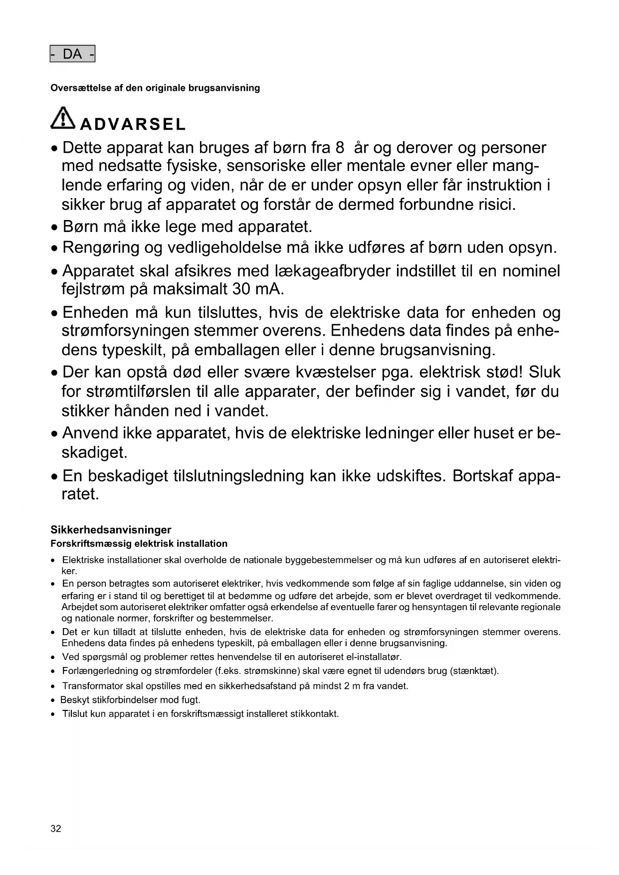 - Apparatet skal afsikres med lækageafbryder indstillet til en nominel fejlstrøm på maksimalt 30 mA.