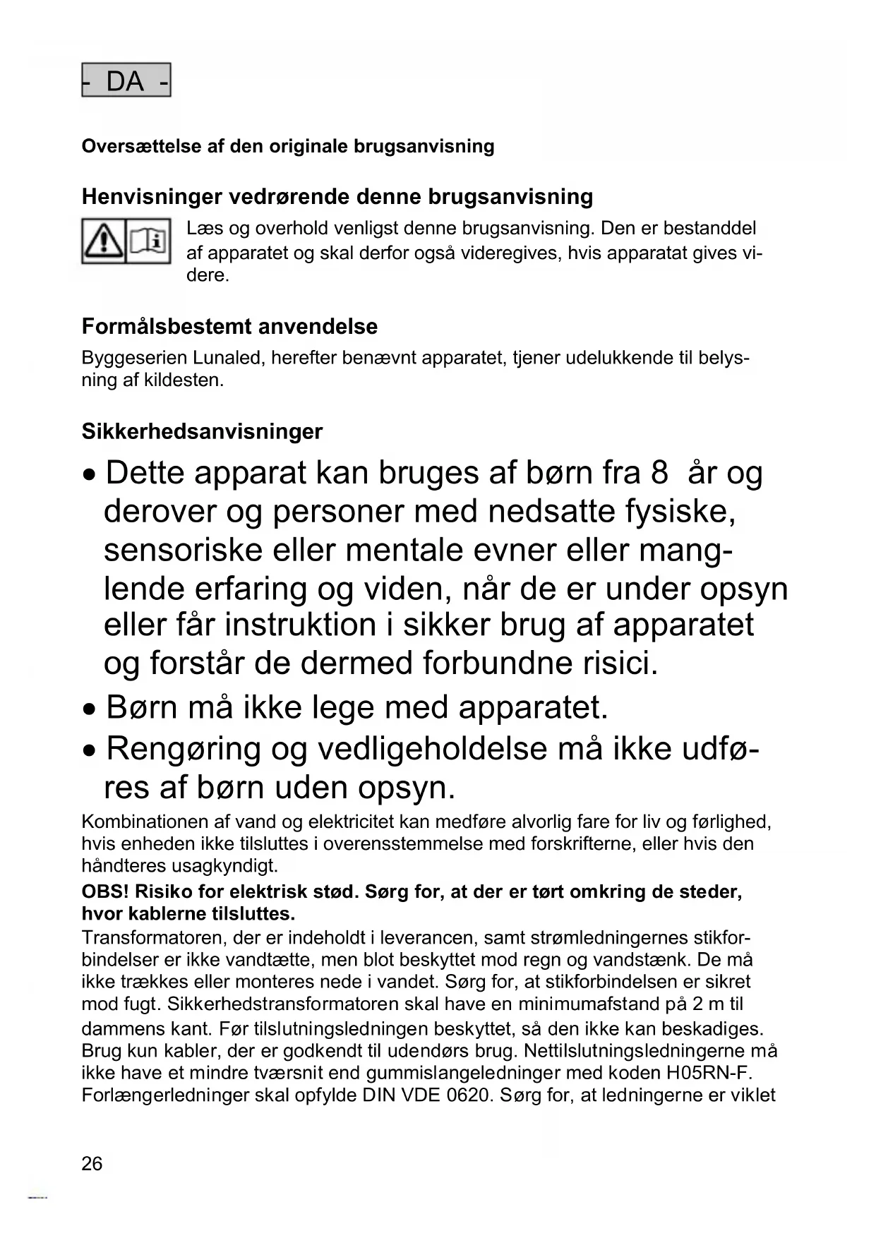 - Rengøring og vedligeholdelse må ikke udfø- res af børn uden opsyn. Kombinationen af vand og elektricitet kan medføre alvorlig fare for liv og førlighed, hvis enheden ikke tilsluttes i overensstemmelse med forskrifterne, eller hvis den håndteres usagkyndigt. OBS! Risiko for elektrisk stød. Sørg for, at der er tørt omkring de steder, hvor kablerne tilsluttes. Transformatoren, der er indeholdt i leverancen, samt strømledningernes stikfor- bindelser er ikke vandtætte, men blot beskyttet mod regn og vandstænk. De må ikke trækkes eller monteres nede i vandet. Sørg for, at stikforbindelsen er sikret mod fugt. Sikkerhedstransformatoren skal have en minimumafstand på 2 m til dammens kant. Før tilslutningsledningen beskyttet, så den ikke kan beskadiges. Brug kun kabler, der er godkendt til udendørs brug. Nettilslutningsledningerne må ikke have et mindre tværsnit end gummislangeledninger med koden H05RN-F. Forlængerledninger skal opfylde DIN VDE 0620. Sørg for, at ledningerne er viklet- DA -