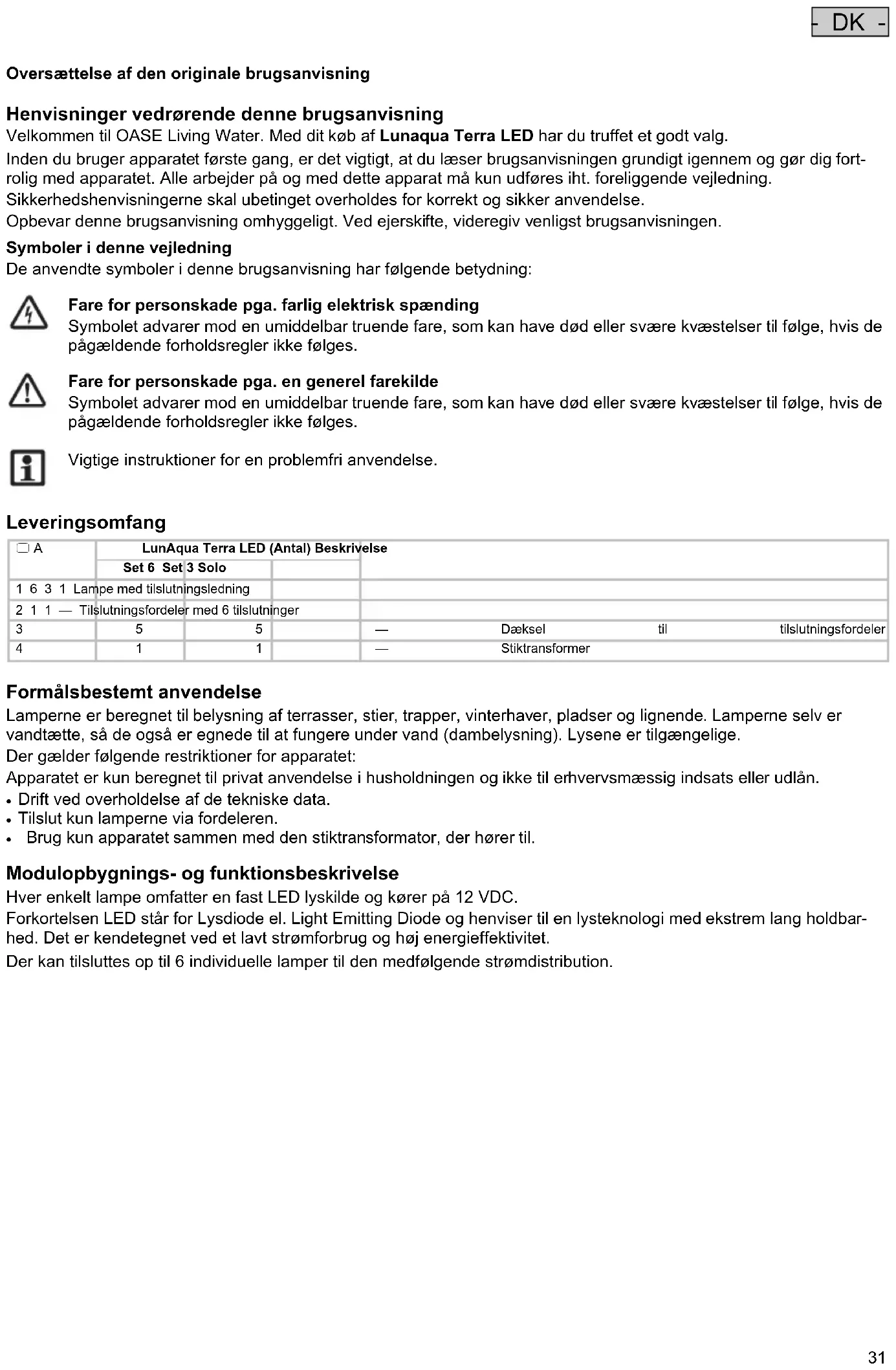 - DK - Oversættelse af den originale brugsanvisning Henvisninger vedrørende denne brugsanvisning Velkommen til OASE Living Water. Med dit køb af Lunaqua Terra LED har du truffet et godt valg. Inden du bruger apparatet første gang, er det vigtigt, at du læser brugsanvisningen grundigt igennem og gør dig fort- rolig med apparatet. Alle arbejder på og med dette apparat må kun udføres iht. foreliggende vejledning. Sikkerhedshenvisningerne skal ubetinget overholdes for korrekt og sikker anvendelse. Opbevar denne brugsanvisning omhyggeligt. Ved ejerskifte, videregiv venligst brugsanvisningen. Symboler i denne vejledning De anvendte symboler i denne brugsanvisning har følgende betydning: