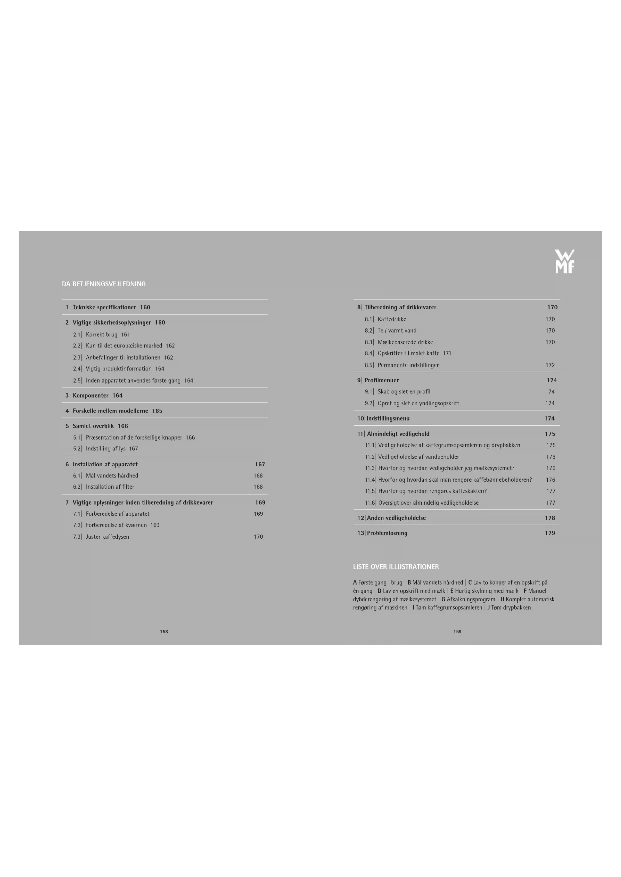 FULDAUTOMATISK KAFFEMASKINE Tillykke! Du er nu den stolte ejer af din WMF Perfection fuldautomatiske kaffemaskine. De drikke, du drikker oftest, er tilgængelige med et enkelt tryk på hovedskærmen. Skærmen gør det muligt for dig at følge din kaffe på vej og giver enkel adgang til de forskellige menuer. De fleste drikke kan fremstilles i par, hvilket sparer tid og er langt hyggeligere.Vi ønsker dig mange års nydelse med din WMF Perfection fuldautomatiske kaffemaskine. 1| TEKNISKE SPECIFIKATIONER Apparat: WMF Perfection fuldautomatisk kaffemaskineStrømforsyning: 220 –240 V~ / 50 HzPumpetryk: 15 barKaffebønnebeholder: 250 gKapacitet, kaffegrumsbeholder: 15 portionerVandbeholder: 2,0 lStrømforbrug: I drift: 1,550 WBrug og opbevaring: Indendørs, tørt (beskyttet mod frost)Ledningslængde (m): ca. 1,1Dimensioner (mm) H × B × D: 395 × 285 × 480Vægt (kg): 12,0Garantiperioden for dette apparat er 2 år. Se venligst garantidokumentet for yderligere oplysninger om andre garantibetingelser i dit land.Producent:SAS GSMRue Saint-Léonard F-53104 MayenneFrankrig 2| VIGTIGE SIKKERHEDSOPLYSNINGER Vigtig information indikeres i denne betjenings-vejledning ved hjælp af symboler og signalord: ADVARSEL indikerer en farlig situation, som kan forårsage alvorlig skade. FORSIGTIG indikerer en potentielt farlig situ-ation, som kan forårsage mindre eller mode-rate skader. VIGTIGT indikerer en situation, der kan forår-sage materielle skader. BEMÆRK giver yderligere information om sik-ker håndtering af produktet.Symboler: observer og følg disse indikationer. 2.1| KORREKT BRUG
