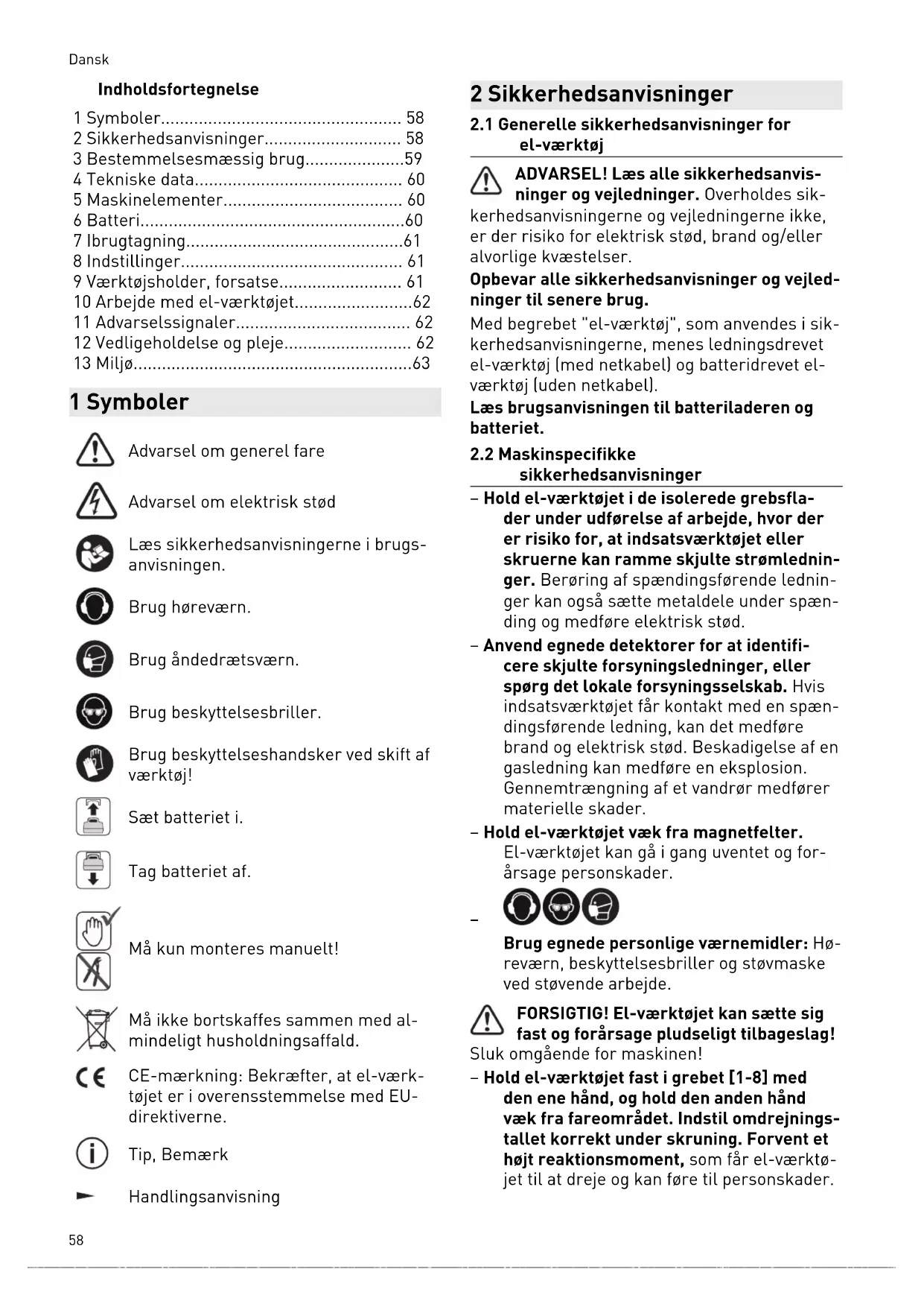 sikkerhedsanvisninger – Hold el-værktøjet i de isolerede grebsfla der under udførelse af arbejde, hvor der er risiko for, at indsatsværktøjet eller skruerne kan ramme skjulte strømlednin ger. Berøring af spændingsførende lednin ger kan også sætte metaldele under spæn ding og medføre elektrisk stød. – Anvend egnede detektorer for at identifi cere skjulte forsyningsledninger, eller spørg det lokale forsyningsselskab. Hvis indsatsværktøjet får kontakt med en spæn dingsførende ledning, kan det medføre brand og elektrisk stød. Beskadigelse af en gasledning kan medføre en eksplosion. Gennemtrængning af et vandrør medfører materielle skader. – Hold el-værktøjet væk fra magnetfelter. El-værktøjet kan gå i gang uventet og for årsage personskader.