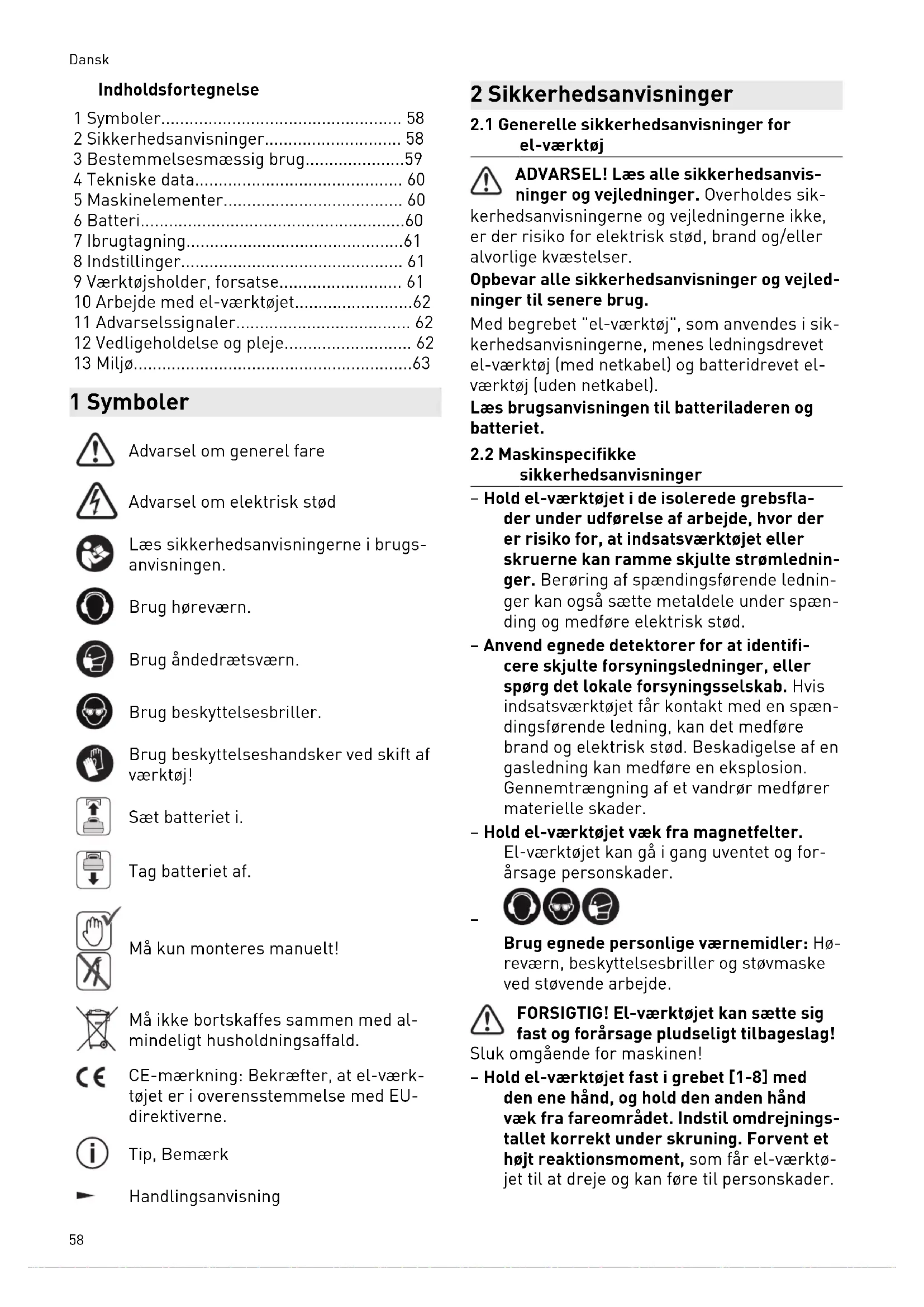 sikkerhedsanvisninger – Hold el-værktøjet i de isolerede grebsfla der under udførelse af arbejde, hvor der er risiko for, at indsatsværktøjet eller skruerne kan ramme skjulte strømlednin ger. Berøring af spændingsførende lednin ger kan også sætte metaldele under spæn ding og medføre elektrisk stød. – Anvend egnede detektorer for at identifi cere skjulte forsyningsledninger, eller spørg det lokale forsyningsselskab. Hvis indsatsværktøjet får kontakt med en spæn dingsførende ledning, kan det medføre brand og elektrisk stød. Beskadigelse af en gasledning kan medføre en eksplosion. Gennemtrængning af et vandrør medfører materielle skader. – Hold el-værktøjet væk fra magnetfelter. El-værktøjet kan gå i gang uventet og for årsage personskader.