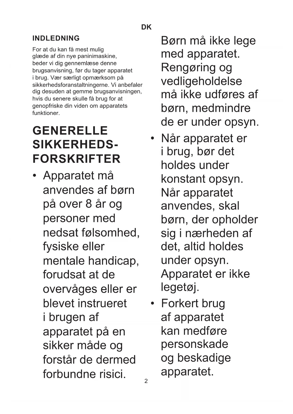 INDLEDNING For at du kan få mest mulig glæde af din nye paninimaskine, beder vi dig gennemlæse denne brugsanvisning, før du tager apparatet i brug. Vær særligt opmærksom på sikkerhedsforanstaltningerne. Vi anbefaler dig desuden at gemme brugsanvisningen, hvis du senere skulle få brug for at genopfriske din viden om apparatets funktioner. GENERELLE SIKKERHEDS- FORSKRIFTER