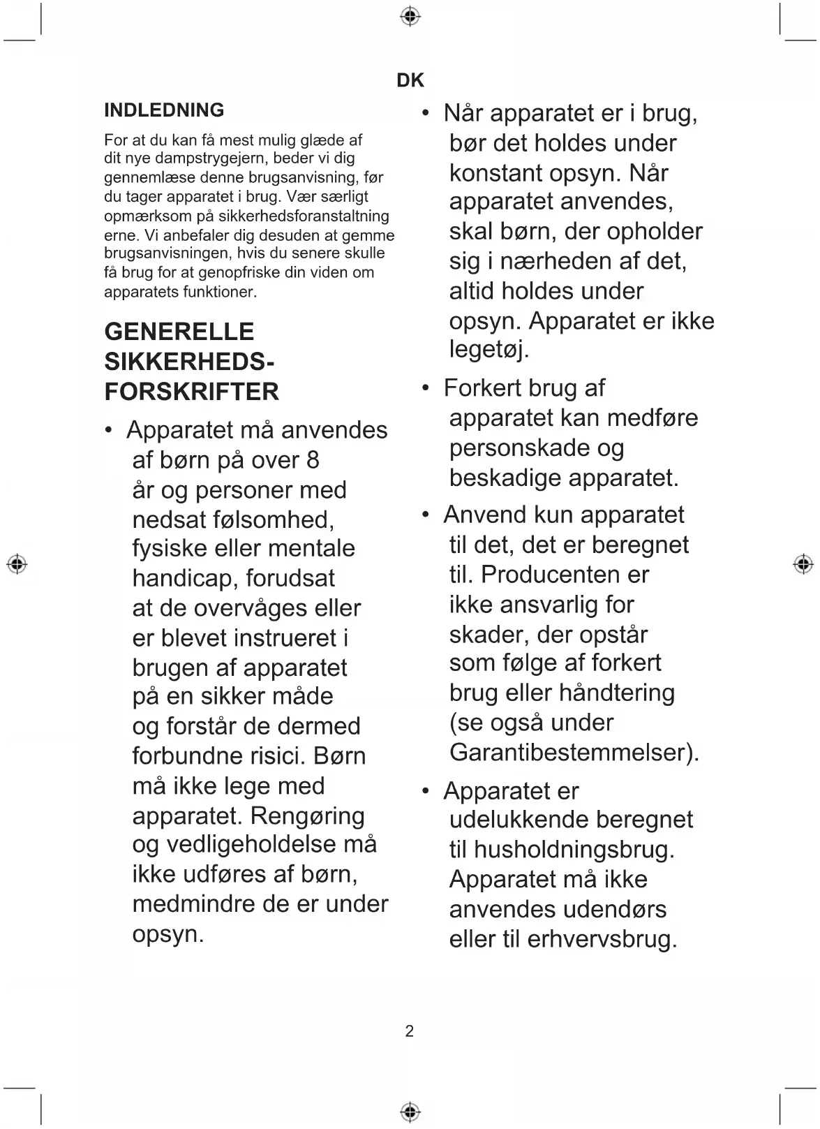 INDLEDNING For at du kan få mest mulig glæde af dit nye dampstrygejern, beder vi dig gennemlæse denne brugsanvisning, før du tager apparatet i brug. Vær særligt opmærksom på sikkerhedsforanstaltning erne. Vi anbefaler dig desuden at gemme brugsanvisningen, hvis du senere skulle få brug for at genopfriske din viden om apparatets funktioner. GENERELLE SIKKERHEDS- FORSKRIFTER