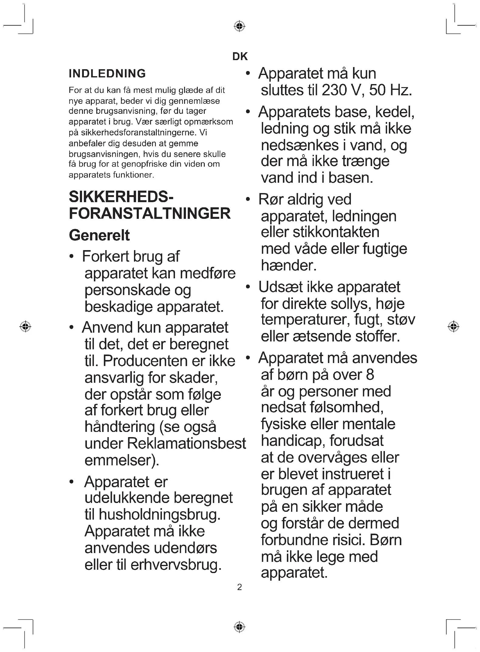- Apparatet er udelukkende beregnet til husholdningsbrug. Apparatet må ikke anvendes udendørs eller til erhvervsbrug.