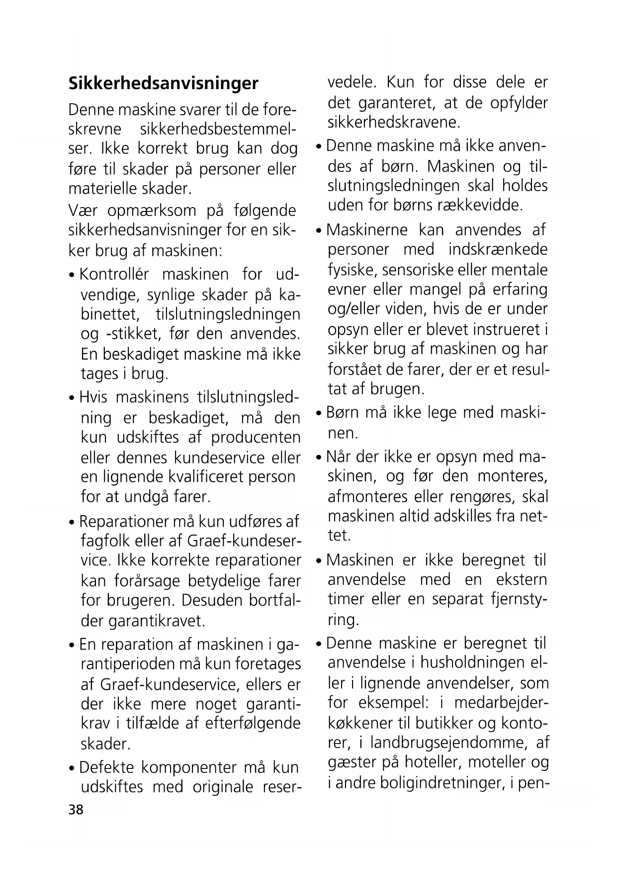 - Reparationer må kun udføres af fagfolk eller af Graef-kundeser- vice. Ikke korrekte reparationer kan forårsage betydelige farer for brugeren. Desuden bortfal- der garantikravet.