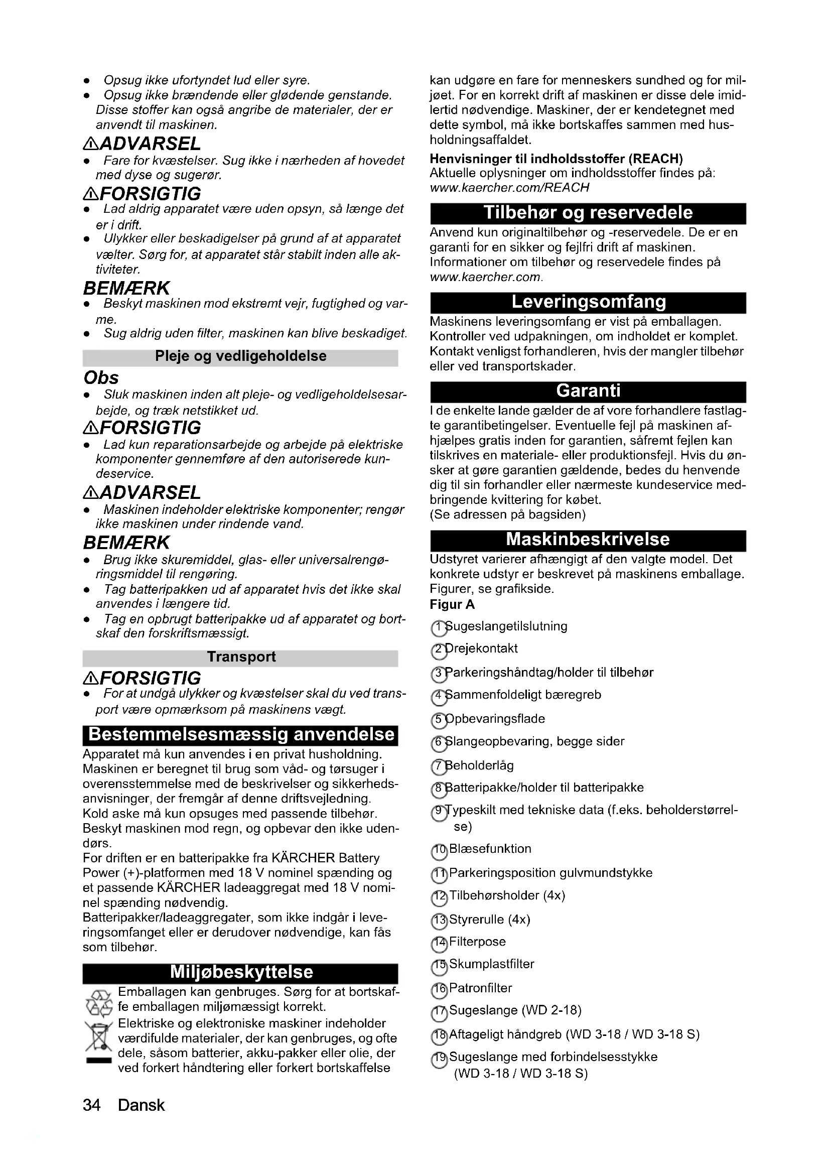 • Tekniske data Dansk ● Opsug ikke ufortyndet lud eller syre. ● Opsug ikke brændende eller glødende genstande. Disse stoffer kan også angribe de materialer, der er anvendt til maskinen. 몇 ADVARSEL ● Fare for kvæstelser. Sug ikke i nærheden af hovedet med dyse og sugerør. 몇 FORSIGTIG ● Lad aldrig apparatet være uden opsyn, så længe det er i drift. ● Ulykker eller beskadigelser på grund af at apparatet vælter. Sørg for, at apparatet står stabilt inden alle ak- tiviteter. BEMÆRK ● Beskyt maskinen mod ekstremt vejr, fugtighed og var- me. ● Sug aldrig uden filter, maskinen kan blive beskadiget. Pleje og vedligeholdelse Obs ● Sluk maskinen inden alt pleje- og vedligeholdelsesar- bejde, og træk netstikket ud. 몇 FORSIGTIG ● Lad kun reparationsarbejde og arbejde på elektriske komponenter gennemføre af den autoriserede kun- deservice. 몇 ADVARSEL ● Maskinen indeholder elektriske komponenter; rengør ikke maskinen under rindende vand. BEMÆRK ● Brug ikke skuremiddel, glas- eller universalrengø- ringsmiddel til rengøring. ● Tag batteripakken ud af apparatet hvis det ikke skal anvendes i længere tid. ● Tag en opbrugt batteripakke ud af apparatet og bort- skaf den forskriftsmæssigt. Transport 몇 FORSIGTIG ● For at undgå ulykker og kvæstelser skal du ved trans- port være opmærksom på maskinens vægt. Bestemmelsesmæssig anvendelse Apparatet må kun anvendes i en privat husholdning. Maskinen er beregnet til brug som våd- og tørsuger i overensstemmelse med de beskrivelser og sikkerheds- anvisninger, der fremgår af denne driftsvejledning. Kold aske må kun opsuges med passende tilbehør. Beskyt maskinen mod regn, og opbevar den ikke uden- dørs. For driften er en batteripakke fra KÄRCHER Battery Power (+)-platformen med 18 V nominel spænding og et passende KÄRCHER ladeaggregat med 18 V nomi- nel spænding nødvendig. Batteripakker/ladeaggregater, som ikke indgår i leve- ringsomfanget eller er derudover nødvendige, kan fås som tilbehør. Miljøbeskyttelse Emballagen kan genbruges. Sørg for at bortskaf- fe emballagen miljømæssigt korrekt. Elektriske og elektroniske maskiner indeholder værdifulde materialer, der kan genbruges, og ofte dele, såsom batterier, akku-pakker eller olie, der ved forkert håndtering eller forkert bortskaffelse kan udgøre en fare for menneskers sundhed og for mil- jøet. For en korrekt drift af maskinen er disse dele imid- lertid nødvendige. Maskiner, der er kendetegnet med dette symbol, må ikke bortskaffes sammen med hus- holdningsaffaldet. Henvisninger til indholdsstoffer (REACH) Aktuelle oplysninger om indholdsstoffer findes på: www.kaercher.com/REACH Tilbehør og reservedele Anvend kun originaltilbehør og -reservedele. De er en garanti for en sikker og fejlfri drift af maskinen. Informationer om tilbehør og reservedele findes på www.kaercher.com. Leveringsomfang Maskinens leveringsomfang er vist på emballagen. Kontroller ved udpakningen, om indholdet er komplet. Kontakt venligst forhandleren, hvis der mangler tilbehør eller ved transportskader. Garanti I de enkelte lande gælder de af vore forhandlere fastlag- te garantibetingelser. Eventuelle fejl på maskinen af- hjælpes gratis inden for garantien, såfremt fejlen kan tilskrives en materiale- eller produktionsfejl. Hvis du øn- sker at gøre garantien gældende, bedes du henvende dig til sin forhandler eller nærmeste kundeservice med- bringende kvittering for købet. (Se adressen på bagsiden) Maskinbeskrivelse Udstyret varierer afhængigt af den valgte model. Det konkrete udstyr er beskrevet på maskinens emballage. Figurer, se grafikside. Figur A 1 Sugeslangetilslutning 2 Drejekontakt 3 Parkeringshåndtag/holder til tilbehør 4 Sammenfoldeligt bæregreb 5 Opbevaringsflade 6 Slangeopbevaring, begge sider 7 Beholderlåg 8 Batteripakke/holder til batteripakke 9 Typeskilt med tekniske data (f.eks. beholderstørrel- se) 10 Blæsefunktion 11 Parkeringsposition gulvmundstykke 12 Tilbehørsholder (4x) 13 Styrerulle (4x) 14 Filterpose 15 Skumplastfilter 16 Patronfilter 17 Sugeslange (WD 2-18) 18 Aftageligt håndgreb (WD 3-18 / WD 3-18 S) 19 Sugeslange med forbindelsesstykke (WD 3-18 / WD 3-18 S)Dansk 35 20 Stænger 2 x 0,5 m 21 Fugedyse 22 Gulvmundstykke 23 * Batteripakke (18 V / 2.5 Ah) 24 * Batteripakke (18 V / 5.0 Ah) 25 * Standardoplader (BC 18 V) 26 Hurtigoplader (BC 18 V) p. 3634