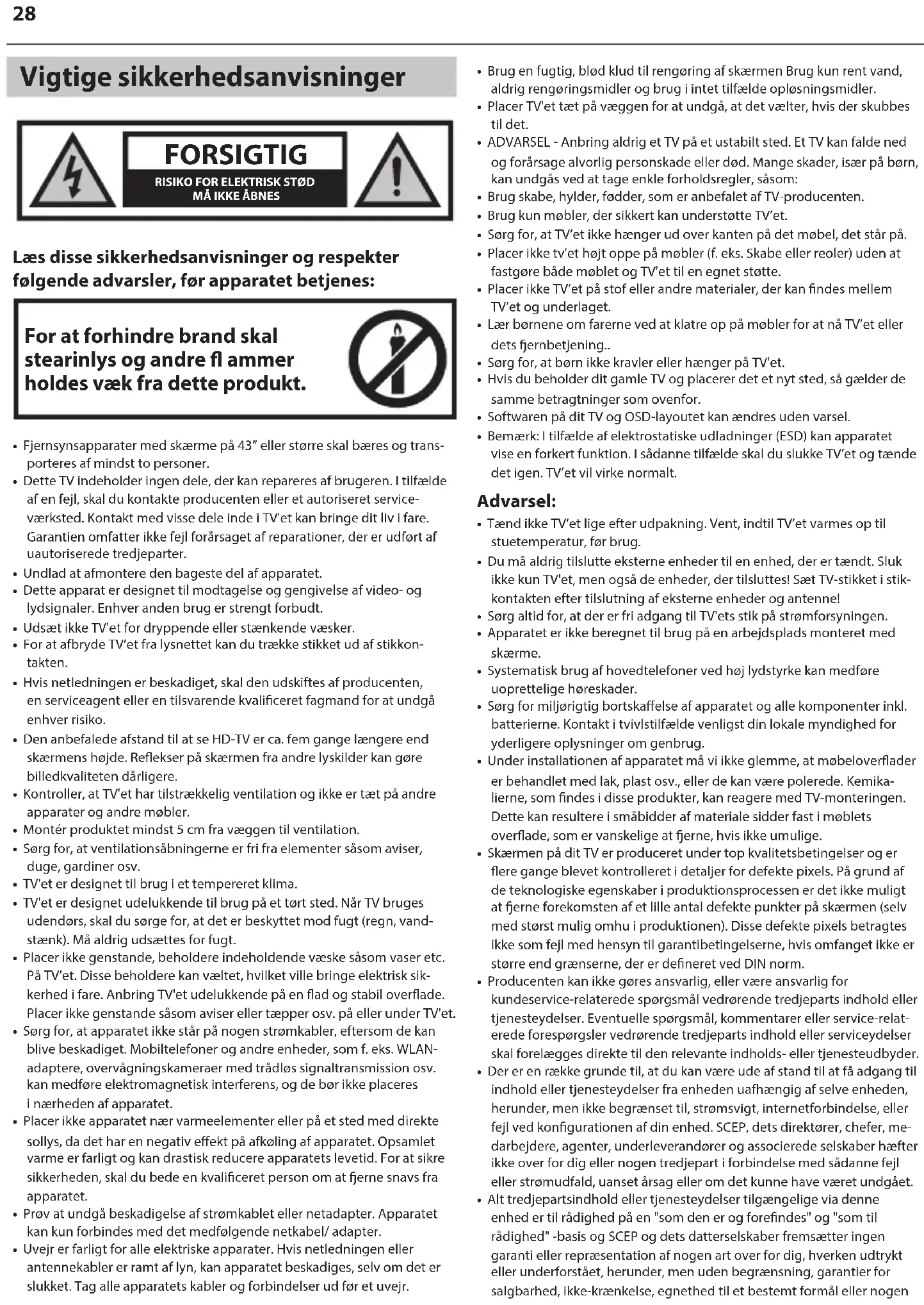 - Dette TV indeholder ingen dele, der kan repareres af brugeren. Itilfælde af en fejl, skal du kontakte producenten eller et autoriseret service- værksted. Kontakt med visse dele inde iTV'et kan bringe dit liv ifare. Garantien omfatter ikke fejl forårsaget af reparationer, der er udført af uautoriserede tredjeparter.