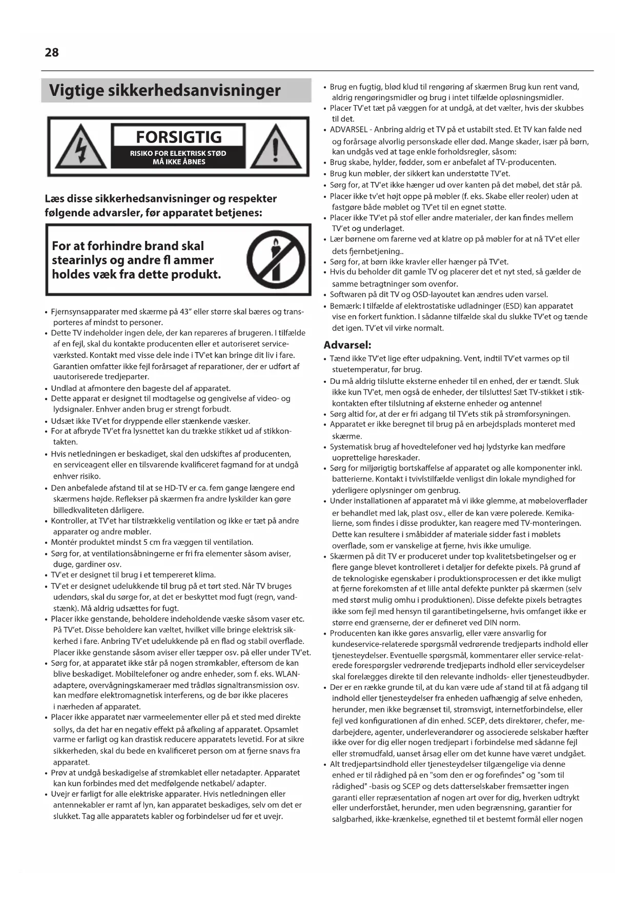 - Dette TV indeholder ingen dele, der kan repareres af brugeren. Itilfælde af en fejl, skal du kontakte producenten eller et autoriseret service- værksted. Kontakt med visse dele inde iTV'et kan bringe dit liv ifare. Garantien omfatter ikke fejl forårsaget af reparationer, der er udført af uautoriserede tredjeparter.