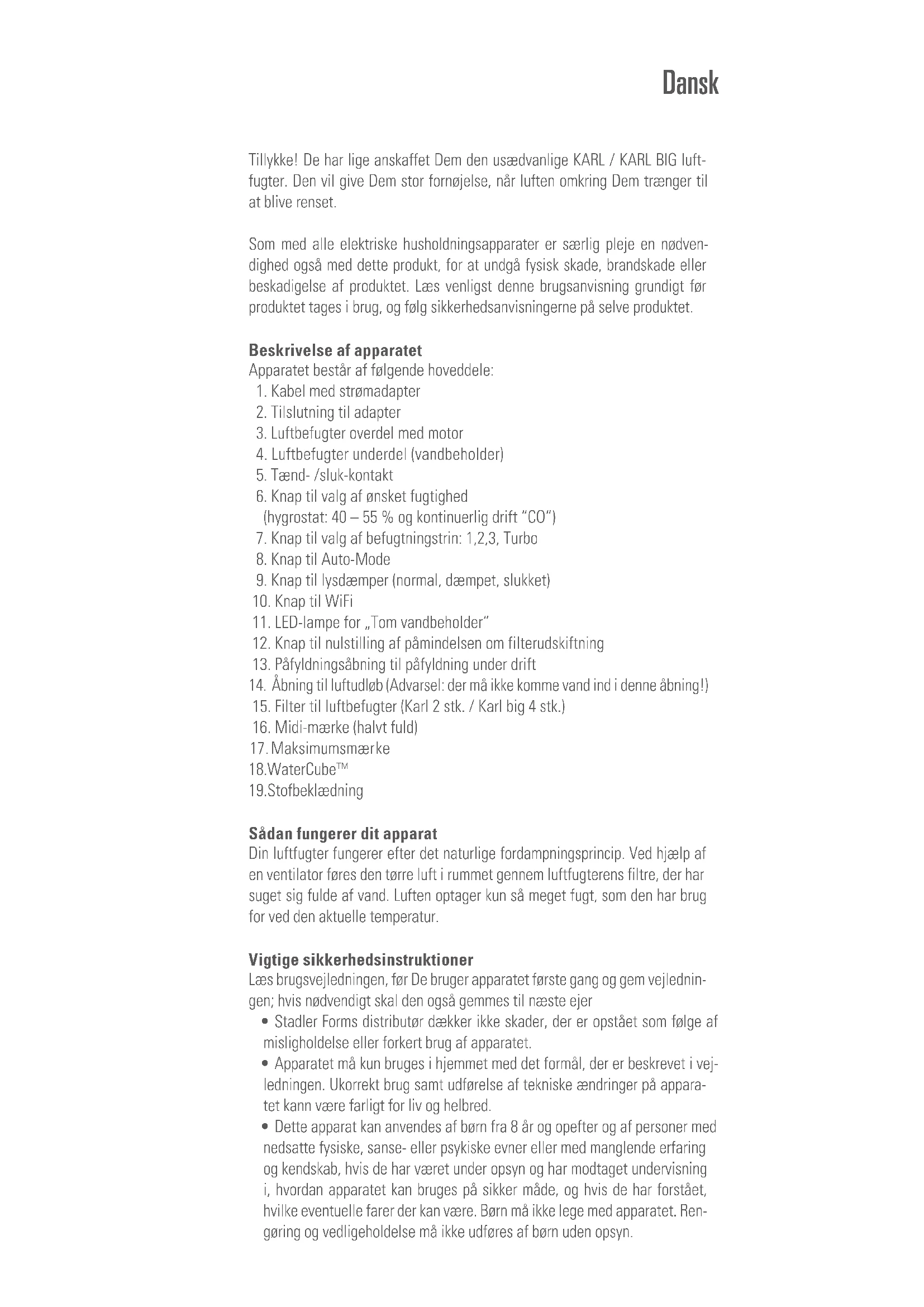 Mitat 502 x 335 x 242 mm (leveys x korkeus x syvyys) Paino 4.6 kg Säiliön tilavuus 11.0 Litraa Melutaso 27 – 60 dB(A) Noudattaa EU- määräyksiä CE / WEEE / RoHS / EAC / UKCA Tässä laitteessa on Stadler Form Aktiengesellschaft:in radiomoduuli tyyppi WBR3. Se toimii ISM-taajuusalueella 2.400 ja 2.4835 GHz:n välisellä alueel- la 20 dBm:n enimmäis-lähetysteholla. Oikeudet muutoksiin pidätetäänGratulerer! Du har akkurat anskaffet deg den eksepsjonelle luftfukteren KARL / KARL BIG. Den vil gi deg mye nytelse og forbedre innendørsluften for deg. Som med alle elektriske husholdningsartikler er det nødvendig å utvise sær- lig hensyn til bruk av denne modellen, for å unngå personskader, brann eller produktskader. Vennligst les nøye gjennom disse driftsinstruksjonene før du tar i bruk apparatet for første gang, og følg sikkerhetsinstruksene på selve apparatet. Beskrivelse av apparatet Apparatet består av følgende hoveddeler: