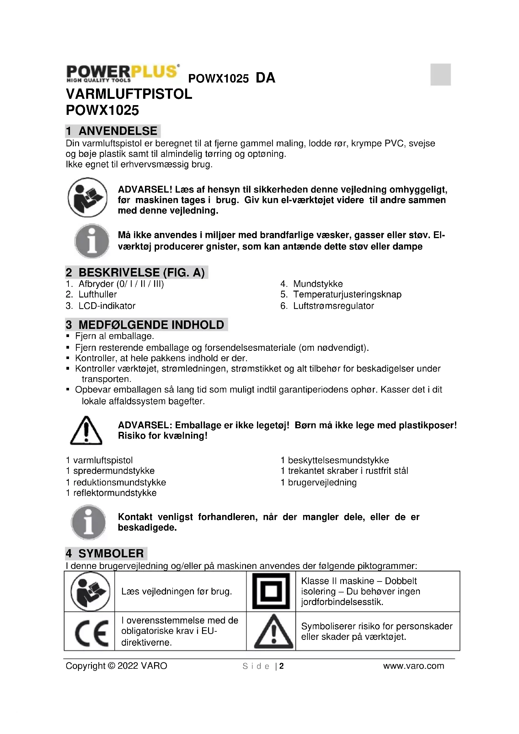 Copyright © 2022 VARO S i d e | 2 www.varo.com VARMLUFTPISTOL POWX1025 1 ANVENDELSE Din varmluftspistol er beregnet til at fjerne gammel maling, lodde rør, krympe PVC, svejse og bøje plastik samt til almindelig tørring og optøning. Ikke egnet til erhvervsmæssig brug. ADVARSEL! Læs af hensyn til sikkerheden denne vejledning omhyggeligt, før maskinen tages i brug. Giv kun el-værktøjet videre til andre sammen med denne vejledning. Må ikke anvendes i miljøer med brandfarlige væsker, gasser eller støv. El- værktøj producerer gnister, som kan antænde dette støv eller dampe 2 BESKRIVELSE (FIG. A)