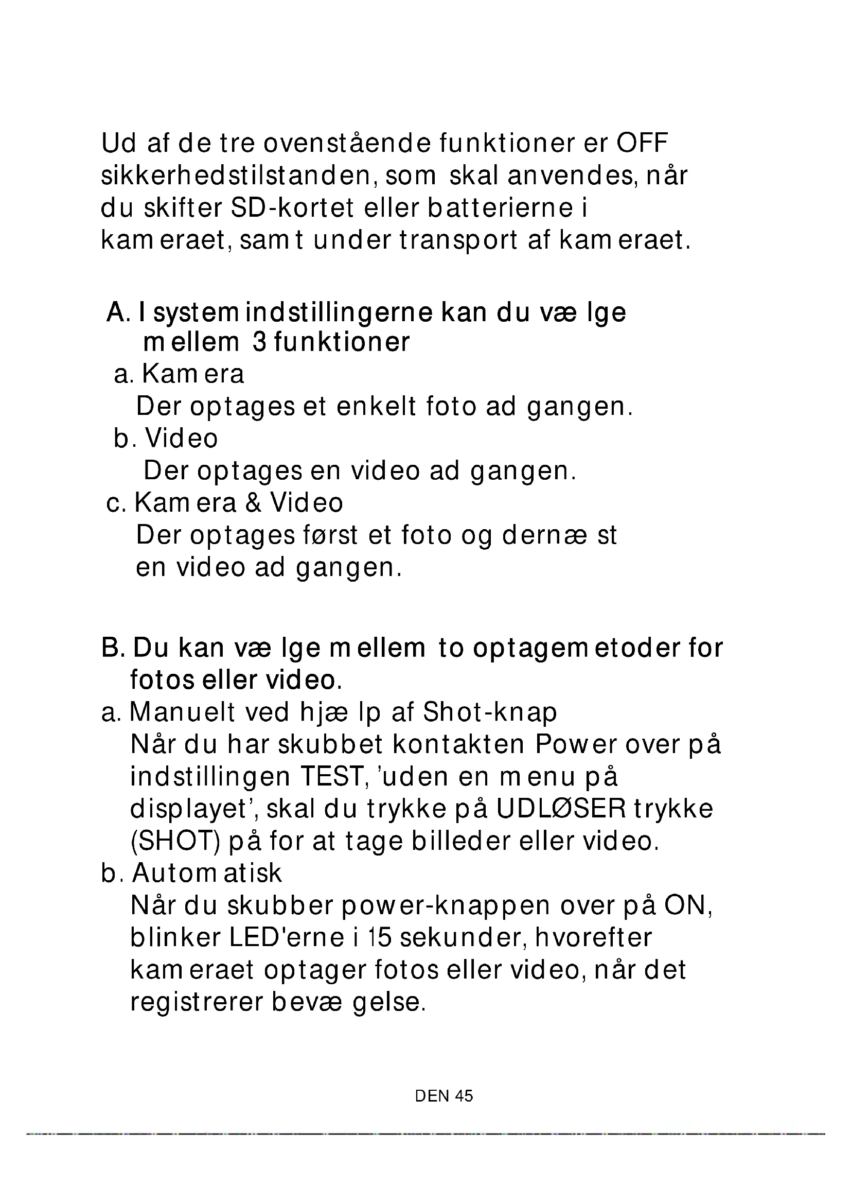 2.ON (tæ ndt): Power-kontakten står på ON. 3.TEST: Power-kontakten står på indstillingen TEST. (ikke inkluderet) (ikke inkluderet) DEN 44Ud af de tre ovenstående funktioner er OFF sikkerhedstilstanden, som skal anvendes, når du skifter SD-kortet eller batterierne i kameraet, samt under transport af kameraet. A.I systemindstillingerne kan du væ lge mellem 3 funktioner a. Kamera Der optages et enkelt foto ad gangen. b. Video Der optages en video ad gangen. c. Kamera & Video Der optages først et foto og dernæ st en video ad gangen. B.Du kan væ lge mellem to optagemetoder for fotos eller video. a. Manuelt ved hjæ lp af Shot-knap Når du har skubbet kontakten Power over på indstillingen TEST, ’uden en menu på displayet’, skal du trykke på UDLØSER trykke (SHOT) på for at tage billeder eller video. b. Automatisk Når du skubber power-knappen over på ON, blinker LED'erne i 15 sekunder, hvorefter kameraet optager fotos eller video, når det registrerer bevæ gelse. DEN 45C. Hvis du vil se de billeder eller video på kameraet, skal du slukke kameraet, skubbe kontakten Power over på indstillingen Test og trykke OK knap at åbne forhåndsvisningen. a. Fotos Tryk på pileknap op eller ned for at se næ ste eller foregående foto. b.Video Tryk på Repaly-knap på for at starte videoen, tryk på en gang til igen for at afbryde. Bemæ rk: Tryk på OK for at vende tilbage til displayet. D.Venligst bemæ rk at dette ikke er en fejl ved kameraet: Kraftigt regnvejr, tåge og støvregn (i mørke) vil give hvide fotos uden motiv E. Afsendelse af billede via 2G/GSM/MMS/GPRS Kom godt i gang