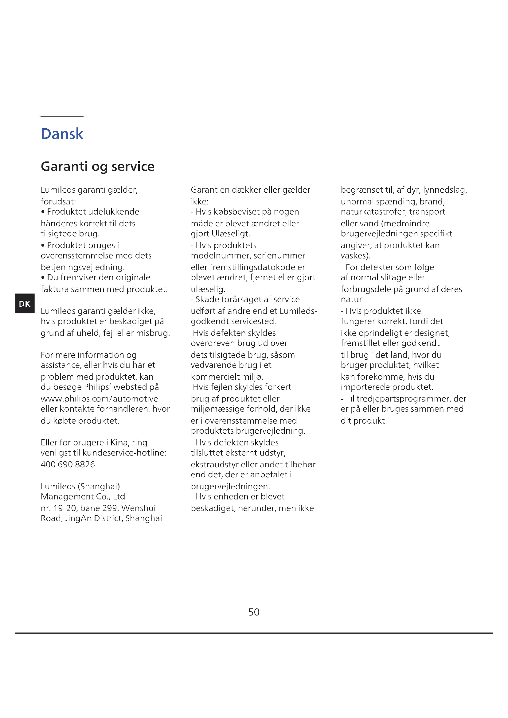 - Du fremviser den originale faktura sammen med produktet. Lumileds garanti gælder ikke, hvis produktet er beskadiget på grundafuheld,fejlellermisbrug. For mere information og assistance, eller hvis du har et problem med produktet, kan dubesøgePhilips’webstedpå www.philips.com/automotive eller kontakte forhandleren, hvor dukøbteproduktet. Eller for brugere i Kina, ring venligst til kundeservice-hotline: