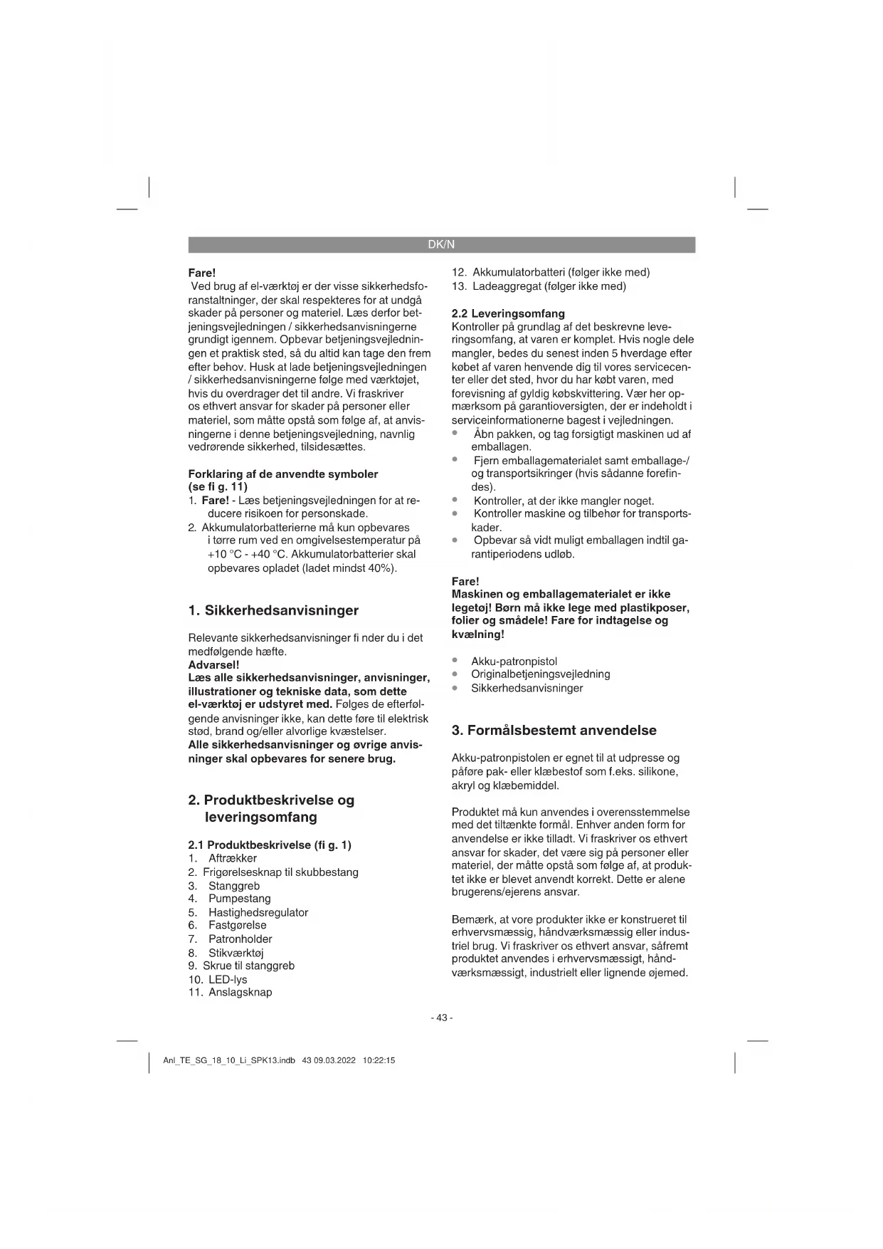 Akku-patronpistolen er egnet til at udpresse og påføre pak- eller klæbestof som f.eks. silikone, akryl og klæbemiddel. Produktet må kun anvendes i overensstemmelse med det tiltænkte formål. Enhver anden form for anvendelse er ikke tilladt. Vi fraskriver os ethvert ansvar for skader, det være sig på personer eller materiel, der måtte opstå som følge af, at produk- tet ikke er blevet anvendt korrekt. Dette er alene brugerens/ejerens ansvar. Bemærk, at vore produkter ikke er konstrueret til erhvervsmæssig, håndværksmæssig eller indus- triel brug. Vi fraskriver os ethvert ansvar, såfremt produktet anvendes i erhvervsmæssigt, hånd- værksmæssigt, industrielt eller lignende øjemed. Anl_TE_SG_18_10_Li_SPK13.indb 43 09.03.2022 10:22:15DK/N