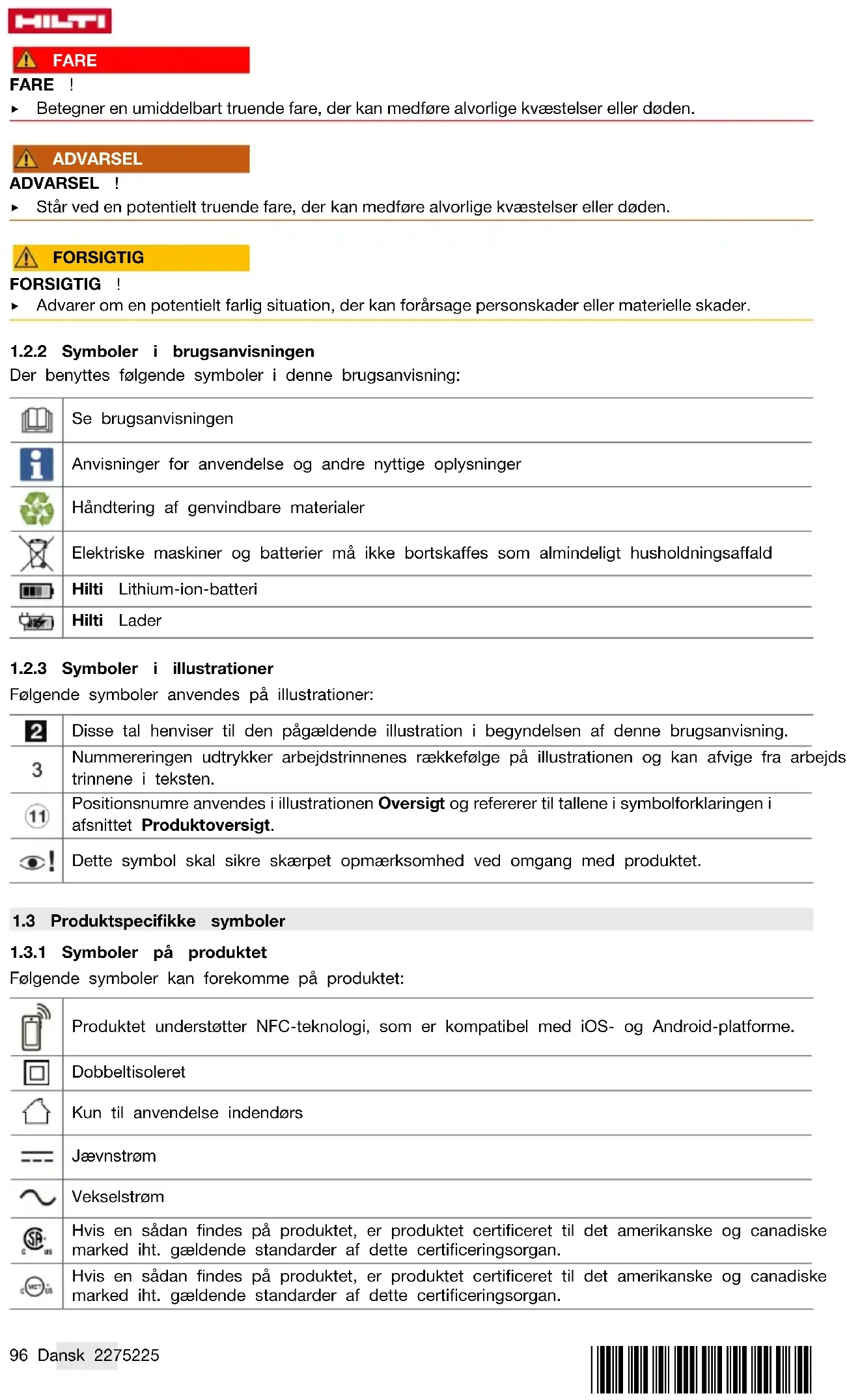 Der benyttes følgende symboler i denne brugsanvisning: Se brugsanvisningen Anvisninger for anvendelse og andre nyttige oplysninger Håndtering af genvindbare materialer Elektriske maskiner og batterier må ikke bortskaffes som almindeligt husholdningsaffald Hilti Lithium-ion-batteri Hilti Lader