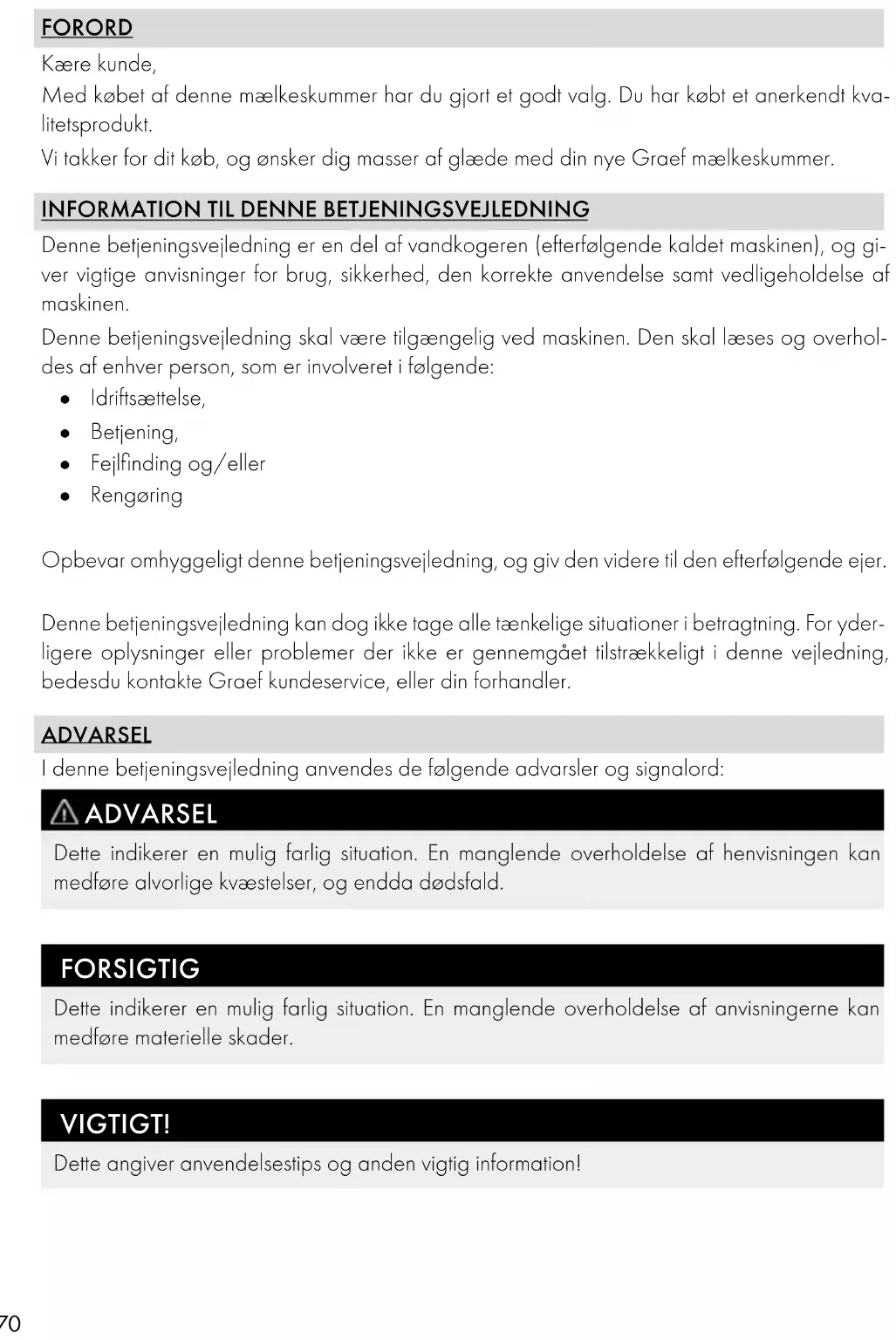 Denne betjeningsvejledning er en del af vandkogeren (efterfølgende kaldet maskinen), og gi- ver vigtige anvisninger for brug, sikkerhed, den korrekte anvendelse samt vedligeholdelse af maskinen. Denne betjeningsvejledning skal være tilgængelig ved maskinen. Den skal læses og overhol- des af enhver person, som er involveret i følgende: ● Idriftsættelse, ● Betjening, ● Fejlfinding og/eller ● Rengøring Opbevar omhyggeligt denne betjeningsvejledning, og giv den videre til den efterfølgende ejer. Denne betjeningsvejledning kan dog ikke tage alle tænkelige situationer i betragtning. For yder- ligere oplysninger eller problemer der ikke er gennemgået tilstrækkeligt i denne vejledning, bedesdu kontakte Graef kundeservice, eller din forhandler. ADVARSEL I denne betjeningsvejledning anvendes de følgende advarsler og signalord: ADVARSEL Dette indikerer en mulig farlig situation. En manglende overholdelse af henvisningen kan medføre alvorlige kvæstelser, og endda dødsfald. FORSIGTIG Dette indikerer en mulig farlig situation. En manglende overholdelse af anvisningerne kan medføre materielle skader. VIGTIGT! Dette angiver anvendelsestips og anden vigtig information!71