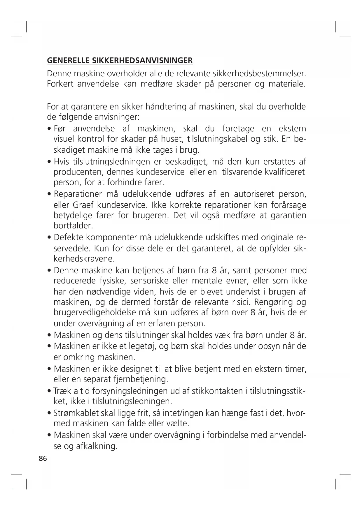 - I dette tilfælde skal der monteres en ny tilslutnings ledning før maskinen må anvendes igen, dette skal udføres af Graef kundeservice eller en autoriseret fagmand.