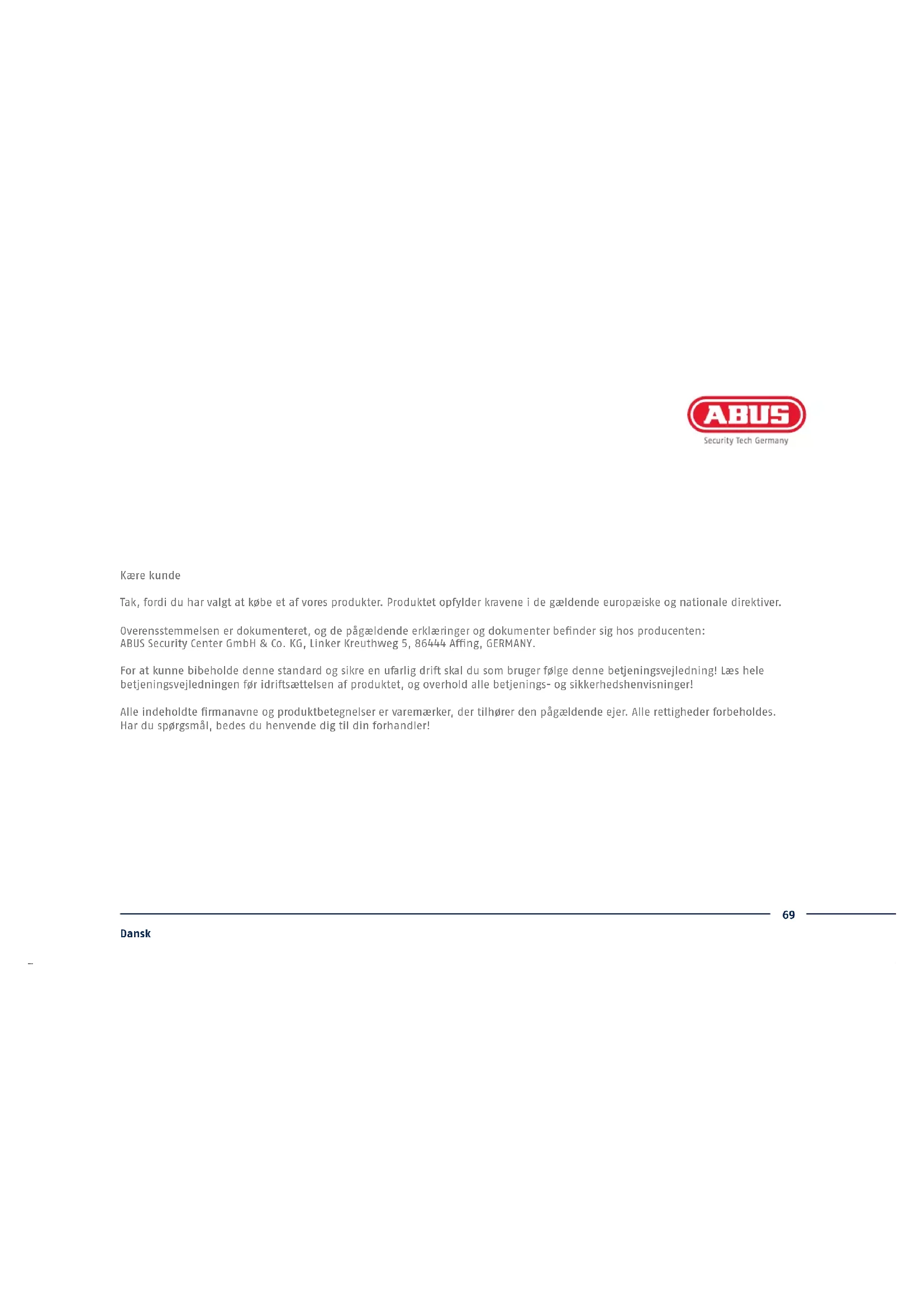 HD-OPTAGER Denne kvikguide beskriver de første opsætningstrin for din analoge HD-optager. Detaljerede informationer ndes i betjeningsvejledningen på hjemmesiden abus.com.69 Dansk Kære kunde Tak, fordi du har valgt at købe et af vores produkter. Produktet opfylder kravene i de gældende europæiske og nationale direktiver. Overensstemmelsen er dokumenteret, og de pågældende erklæringer og dokumenter bender sig hos producenten: ABUS Security Center GmbH & Co. KG, Linker Kreuthweg 5, 86444 Ang, GERMANY. For at kunne bibeholde denne standard og sikre en ufarlig dri skal du som bruger følge denne betjeningsvejledning! Læs hele betjeningsvejledningen før idrisættelsen af produktet, og overhold alle betjenings- og sikkerhedshenvisninger! Alle indeholdte rmanavne og produktbetegnelser er varemærker, der tilhører den pågældende ejer. Alle rettigheder forbeholdes. Har du spørgsmål, bedes du henvende dig til din forhandler!70 Dansk