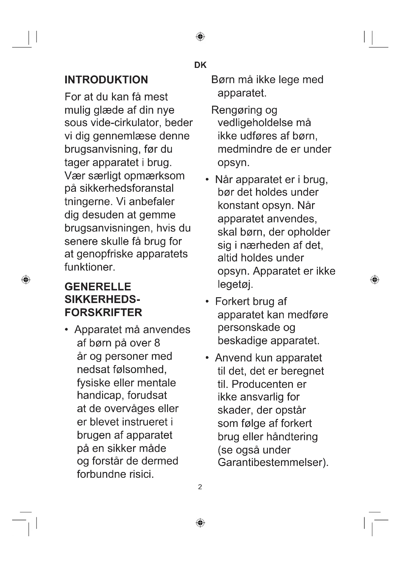 INTRODUKTION For at du kan få mest mulig glæde af din nye sous vide-cirkulator, beder vi dig gennemlæse denne brugsanvisning, før du tager apparatet i brug. Vær særligt opmærksom på sikkerhedsforanstal tningerne. Vi anbefaler dig desuden at gemme brugsanvisningen, hvis du senere skulle få brug for at genopfriske apparatets funktioner. GENERELLE SIKKERHEDS- FORSKRIFTER