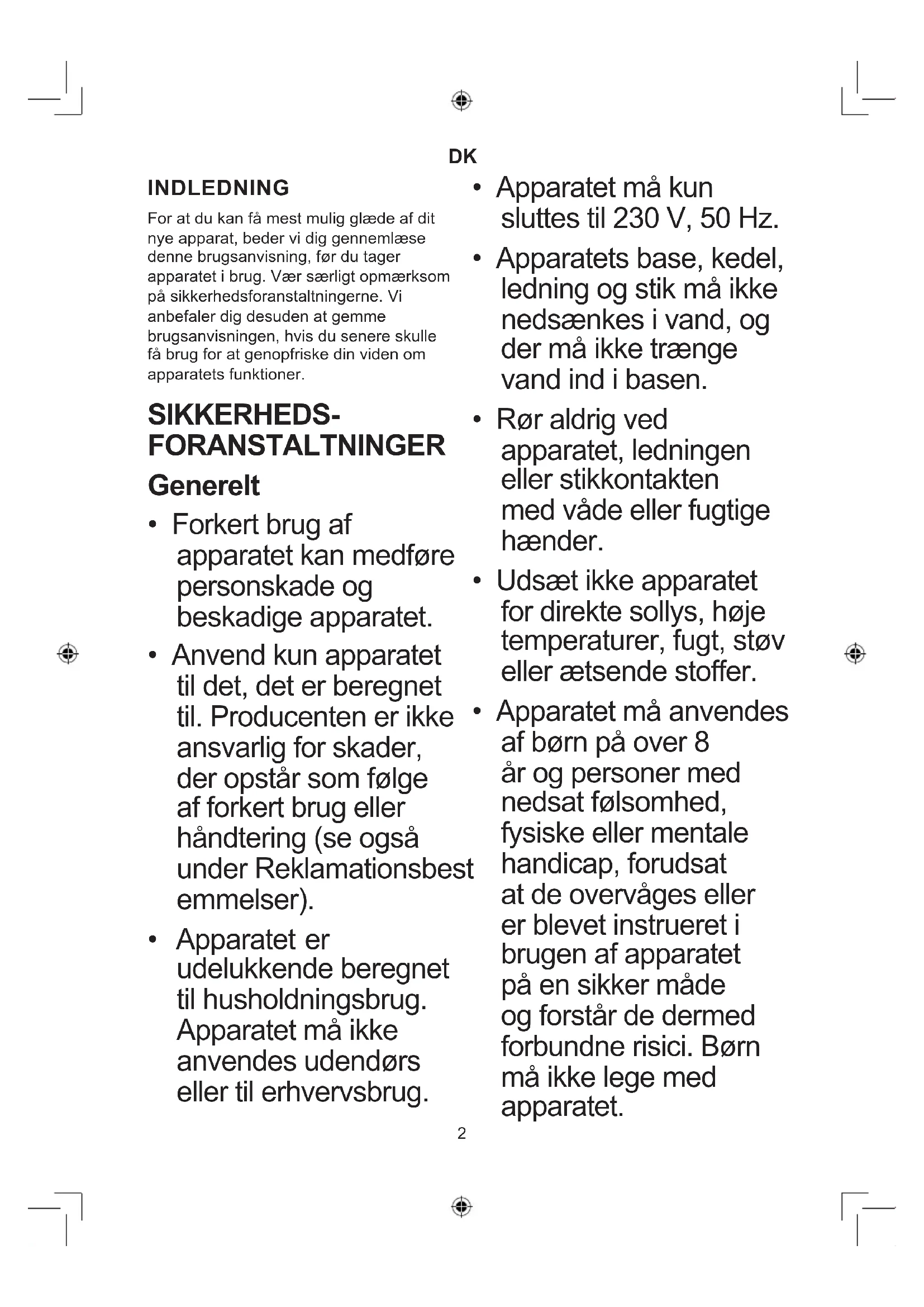 - Apparatet er udelukkende beregnet til husholdningsbrug. Apparatet må ikke anvendes udendørs eller til erhvervsbrug.