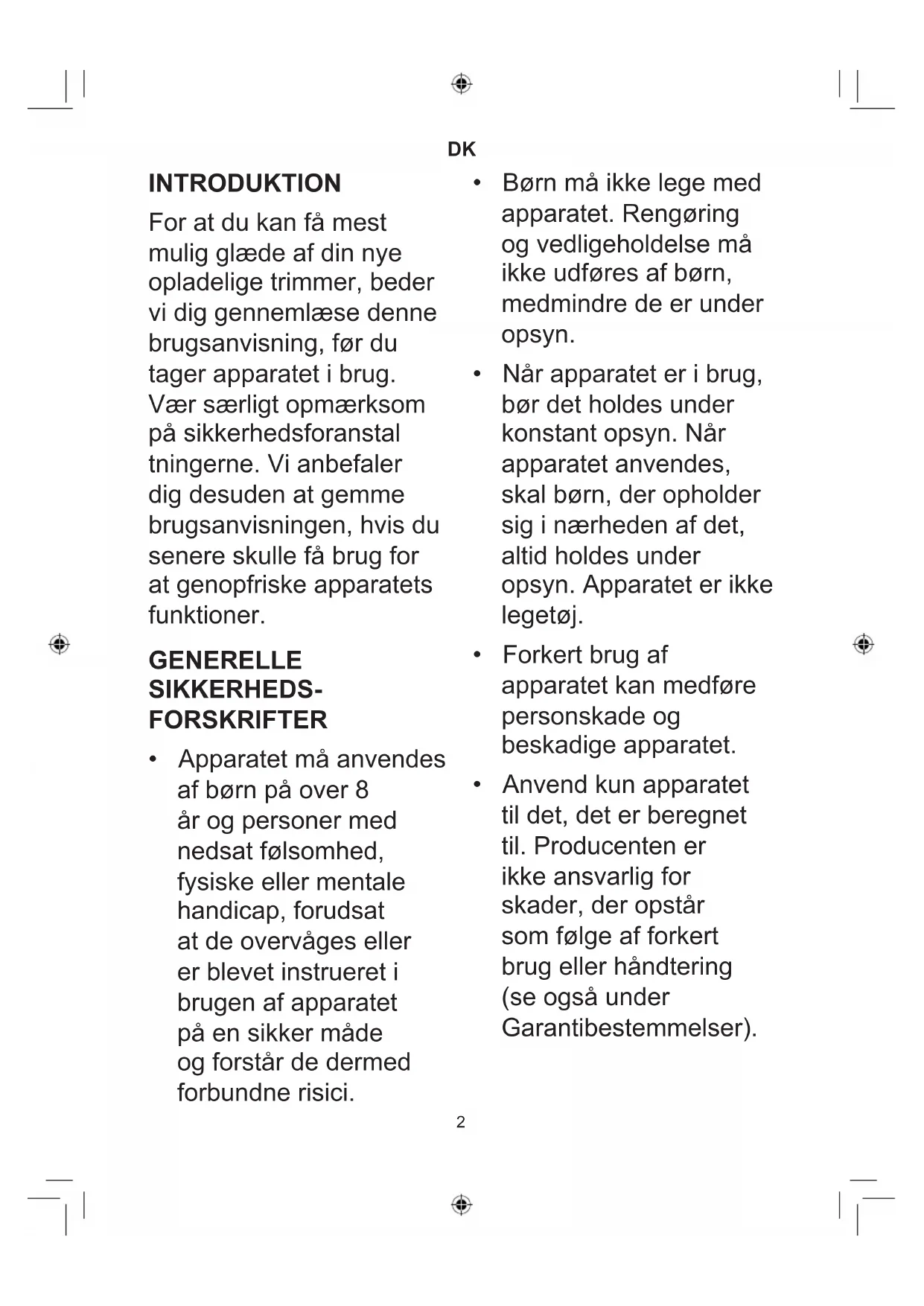 INTRODUKTION For at du kan få mest mulig glæde af din nye opladelige trimmer, beder vi dig gennemlæse denne brugsanvisning, før du tager apparatet i brug. Vær særligt opmærksom på sikkerhedsforanstal tningerne. Vi anbefaler dig desuden at gemme brugsanvisningen, hvis du senere skulle få brug for at genopfriske apparatets funktioner. GENERELLE SIKKERHEDS- FORSKRIFTER