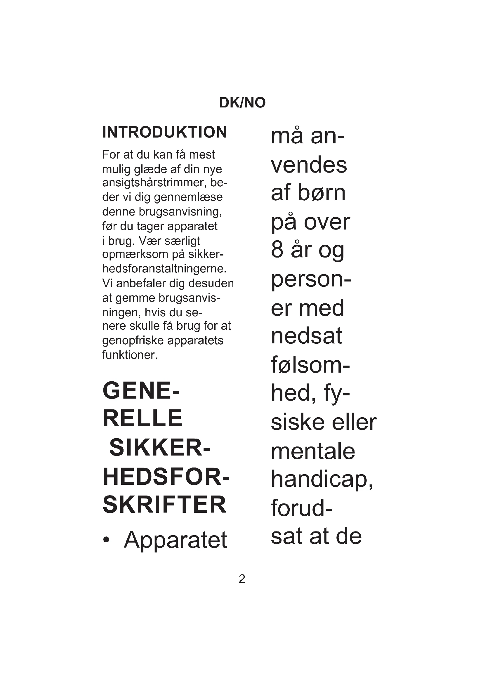 - Apparatet må an- vendes af børn på over 8 år og person- er med nedsat følsom- hed, fy- siske eller mentale handicap, forud- sat at de3 DK/NO overvåges eller er blevet instrueret i brugen af appa- ratet på en sikker måde og forstår de dermed forbundne risici. Børn må ikke lege med ap- paratet. Ren- gøring og vedlige- holdelse må ikke udføres af børn, medmin- dre de er under opsyn.