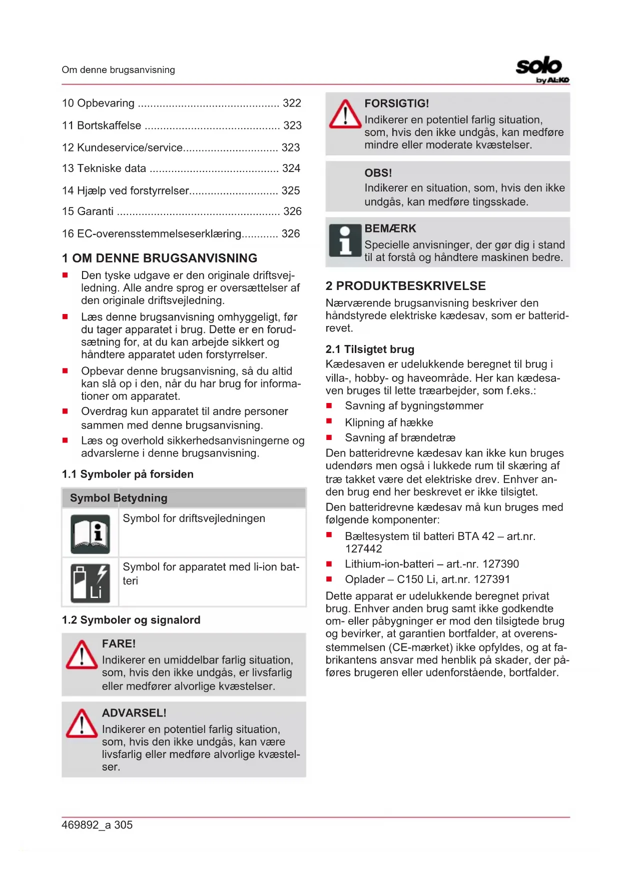 Download vejledningen til din Sav i PDF-format gratis! Find din vejledning CS 4235 - SOLO og tag din elektroniske enhed tilbage i hånden. På denne side er alle dokumenter nødvendige for brugen af din enhed offentliggjort. CS 4235 af mærket SOLO.