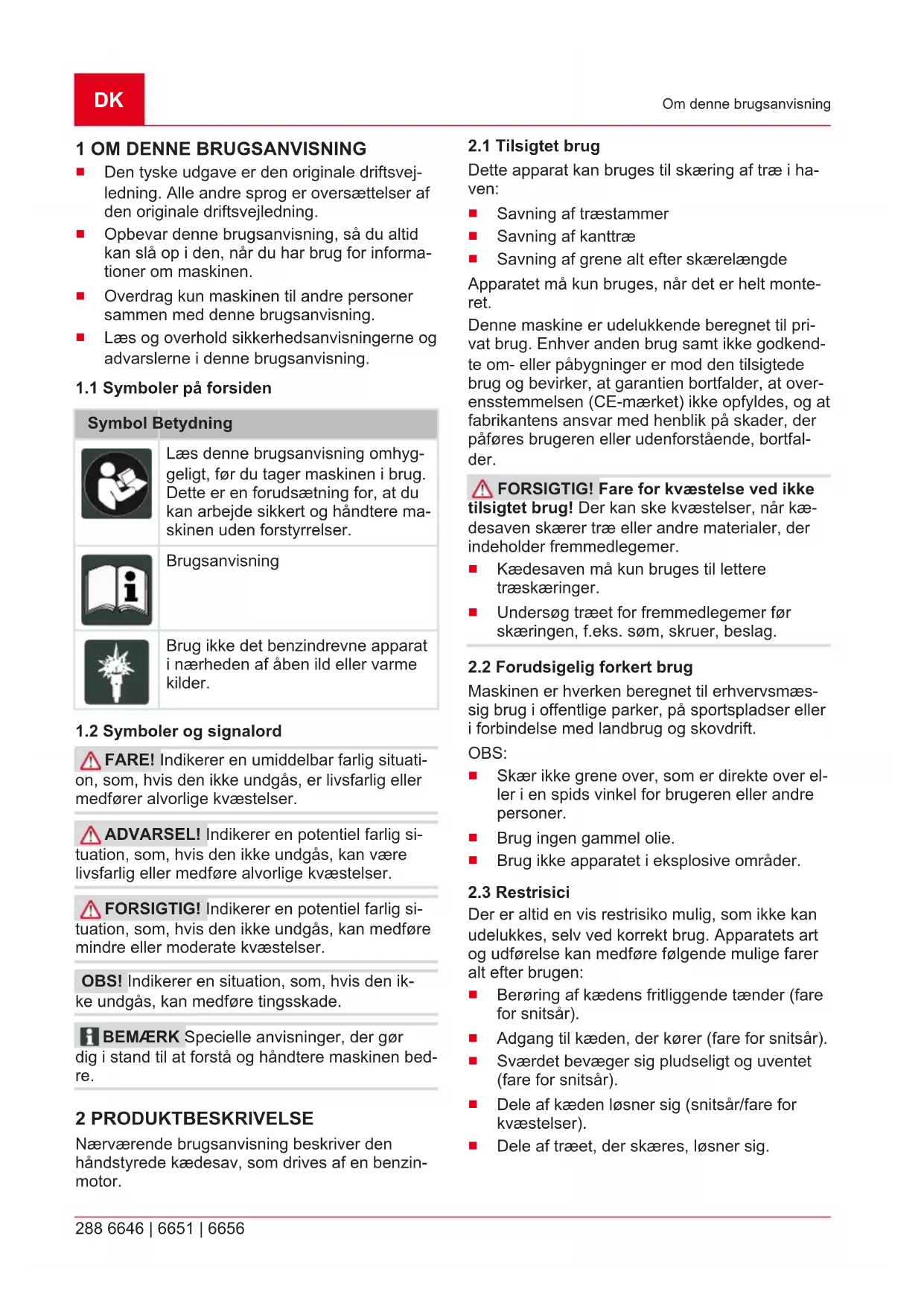 FARE! Indikerer en umiddelbar farlig situati- on, som, hvis den ikke undgås, er livsfarlig eller medfører alvorlige kvæstelser. ADVARSEL! Indikerer en potentiel farlig si- tuation, som, hvis den ikke undgås, kan være livsfarlig eller medføre alvorlige kvæstelser. FORSIGTIG! Indikerer en potentiel farlig si- tuation, som, hvis den ikke undgås, kan medføre mindre eller moderate kvæstelser. OBS! Indikerer en situation, som, hvis den ik- ke undgås, kan medføre tingsskade. BEMÆRK Specielle anvisninger, der gør dig i stand til at forstå og håndtere maskinen bed- re. 2 PRODUKTBESKRIVELSE Nærværende brugsanvisning beskriver den håndstyrede kædesav, som drives af en benzin- motor.