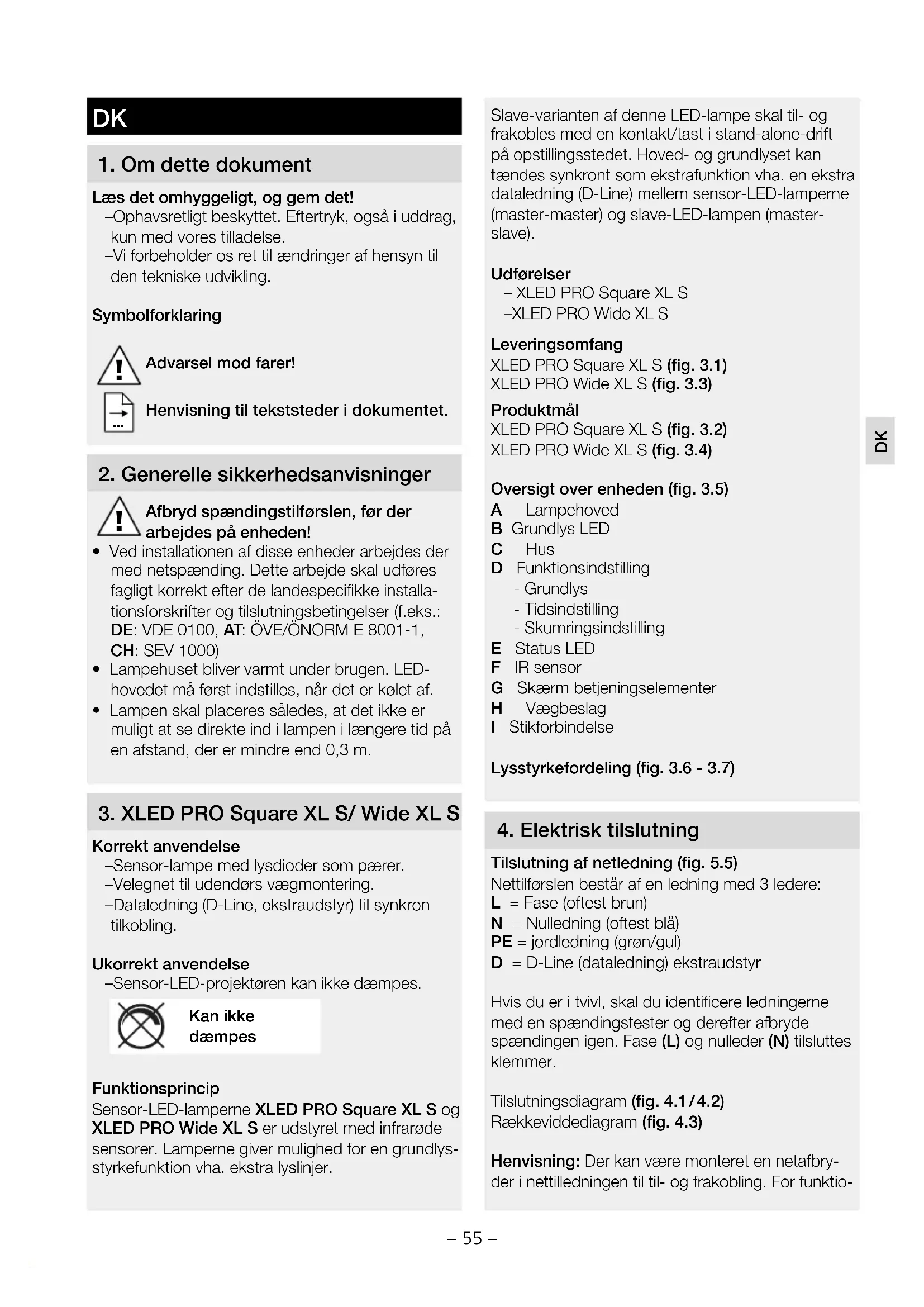 Korrekt anvendelse – Sensor-lampe med lysdioder som pærer. – Velegnet til udendørs vægmontering. – Dataledning (D-Line, ekstraudstyr) til synkron tilkobling. Ukorrekt anvendelse – Sensor-LED-projektøren kan ikke dæmpes. Kan ikke dæmpes Funktionsprincip Sensor-LED-lamperne XLEDPROSquareXLS og XLEDPROWideXLS er udstyret med infrarøde sensorer. Lamperne giver mulighed for en grundlys- styrkefunktion vha. ekstra lyslinjer. Slave-varianten af denne LED-lampe skal til- og frakobles med en kontakt/tast i stand-alone-drift på opstillingsstedet. Hoved- og grundlyset kan tændes synkront som ekstrafunktion vha. en ekstra dataledning (D-Line) mellem sensor-LED-lamperne (master-master) og slave-LED-lampen (master- slave). Udførelser – XLEDPROSquareXLS – XLEDPROWideXLS Leveringsomfang XLEDPROSquareXLS (fig. 3.1) XLEDPROWideXLS (fig. 3.3) Produktmål XLEDPROSquareXLS (fig. 3.2) XLEDPROWideXLS (fig. 3.4) Oversigt over enheden (fig. 3.5) A Lampehoved B Grundlys LED C Hus D Funktionsindstilling - Grundlys - Tidsindstilling - Skumringsindstilling E Status LED F IR sensor G Skærm betjeningselementer H Vægbeslag I Stikforbindelse Lysstyrkefordeling (fig. 3.6 - 3.7)