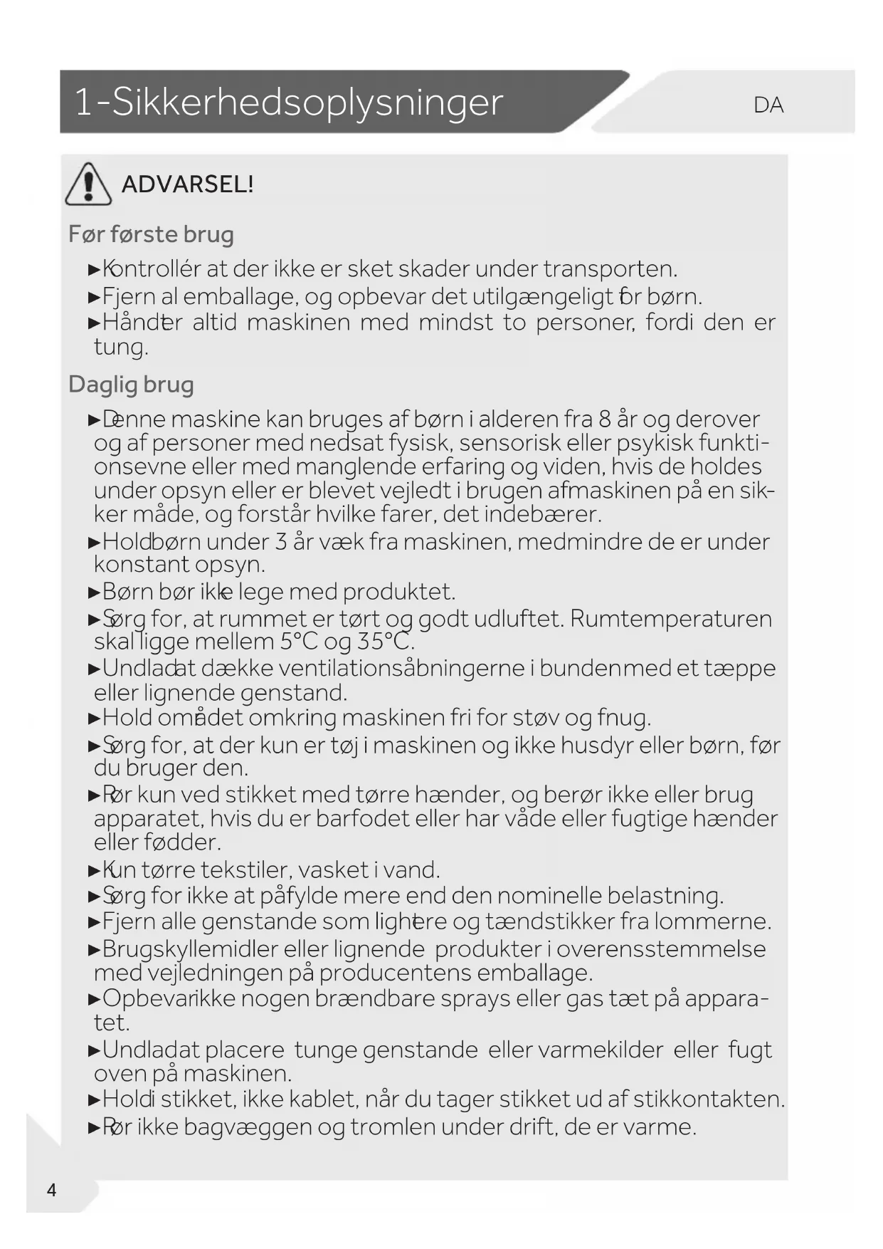 med et tæppe eller lignende genstand. ▶ Hold omr ådet omkring maskinen fri for støv og fnug. ▶ S ørg for, at der kun er tøj i maskinen og ikke husdyr eller børn, før du bruger den. ▶ R ør kun ved stikket med tørre hænder, og berør ikke eller brug apparatet, hvis du er barfodet eller har våde eller fugtige hænder eller fødder. ▶ K un tørre tekstiler, vasket i vand. ▶ S ørg for ikke at påfylde mere end den nominelle belastning. ▶ Fjern alle genstande som light ere og tændstikker fra lommerne. ▶ Brug skyllemidler eller lignende produkter i overensstemmelse med vejledningen på producentens emballage. ▶ Opbevar ikke nogen brændbare sprays eller gas tæt på appara- tet. ▶ Undlad at placere tunge genstande eller varmekilder eller fugt oven på maskinen. ▶ Hold i stikket, ikke kablet, når du tager stikket ud af stikkontakten. ▶ R ør ikke bagvæggen og tromlen under drift, de er varme.DA