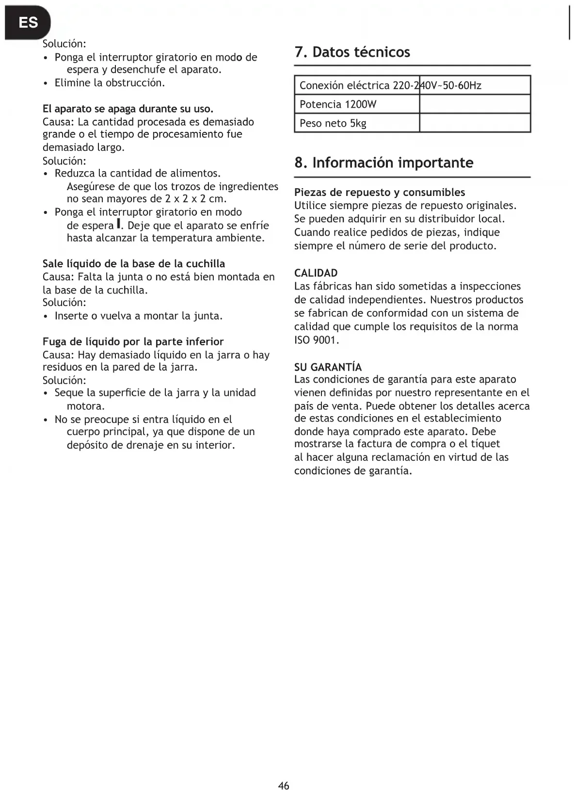 - No se preocupe si entra líquido en el cuerpo principal, ya que dispone de un depósito de drenaje en su interior. ES47 Dette apparat er kun beregnet til husholdningsbrug, som beskrevet i denne brugervejledning. Du bør sikre dig, at du har forstået indholdet af denne brugervejledning fuldt ud, inden apparatet tages i brug. ADVARSEL For at forhindre kvælningsfare for små børn skal alt emballagemateriale kasseres umiddelbart efter at produktet er fjernet. Dette apparat kan anvendes af personer med nedsatte fysiske, sensoriske eller mentale evner eller manglende erfaring og viden, hvis de er under opsyn eller vejledning i at bruge apparatet på en sikker måde og forstår de risici, der er involveret. Børn skal være under opsyn for at sikre, at de ikke bruger eller leger med apparatet. Hold apparatet og dets ledning utilgængeligt for børn. Træk eller bær ikke apparatet i strømledningen. Tag altid stikket ud af stikkontakten ved at trække i stikket i stedet for i ledningen. Placer ikke strømledningen over skarpe kanter eller i nærheden af varme overader. Brug ikke en forlængerledning. Hvis netledningen er ødelagt, skal du stoppe med at bruge støvsugeren øjeblikkeligt. For at undgå en sikkerhedsrisiko, skal en autoriseret Haier servicetekniker udskifte strømkablet. Anvend kun tilbehør, udstyr og reservedele leveret af Haier. ADVARSEL Risiko for personskade! Forkert brug af apparatet kan potentielt føre til personskade. ADVARSEL Skæreblade er meget skarpe. Vær forsigtig, når du håndterer de skarpe skæreblade under montering og adskillelse, tømning af kanden og under rengøring. ADVARSEL Sørg for, at blenderen er slukket, før du fjerner den fra holderen. Afbryd altid apparatet fra strømforsyningen, hvis det efterlades uden opsyn og før montering, adskillelse eller rengøring. Blenderen må kun bruges med den medfølgende holder. Brug kun apparatet i overensstemmelse med strømspecikationen på typeskiltet. Brug kun apparatet på et tørt og plant underlag og yt det aldrig, mens det er i gang. Apparatet er kun beregnet til at blende eller blande fødevarer med anbefalet størrelse og mængde i instruktionerne. Det må ikke bruges til andet end den tilsigtede brug. Brug ikke en glaskande,